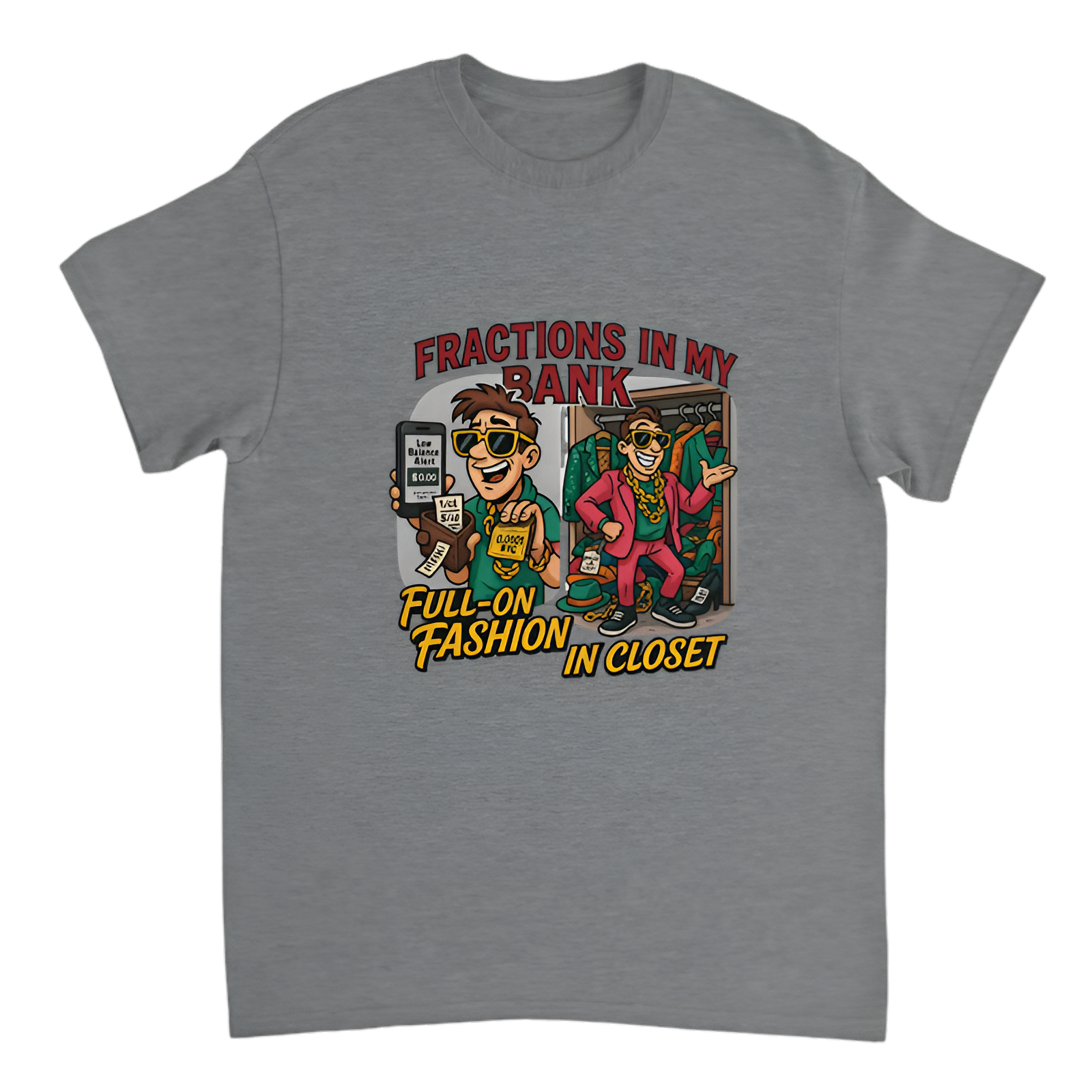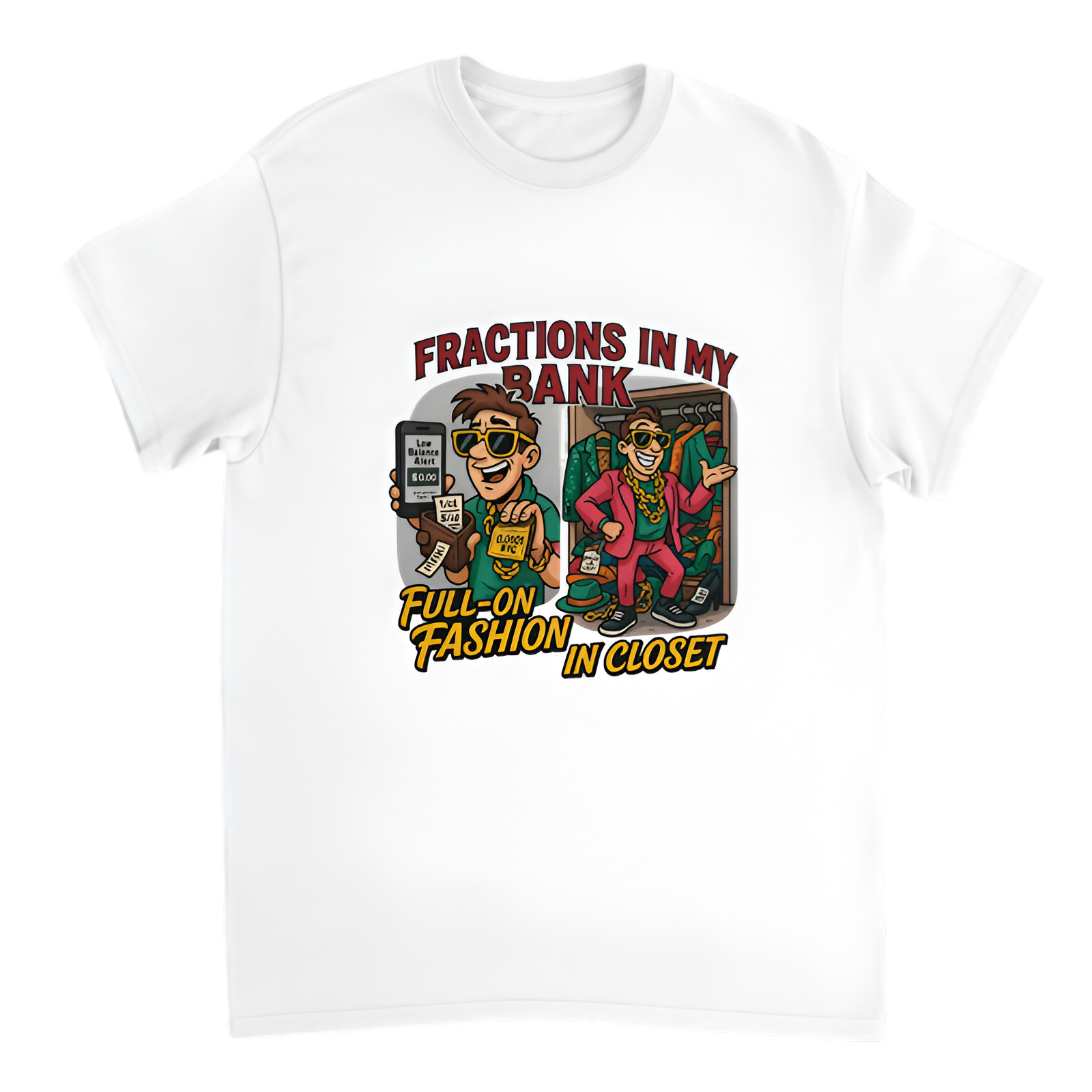 Celebrate style over savings with this witty “Fractions in my bank, full-on fashion in my closet” t-shirt from the Broke Banker series. Perfect for anyone who knows how to look sharp even when their finances don’t. Made from soft, breathable fabric, this tee combines humor and comfort effortlessly.