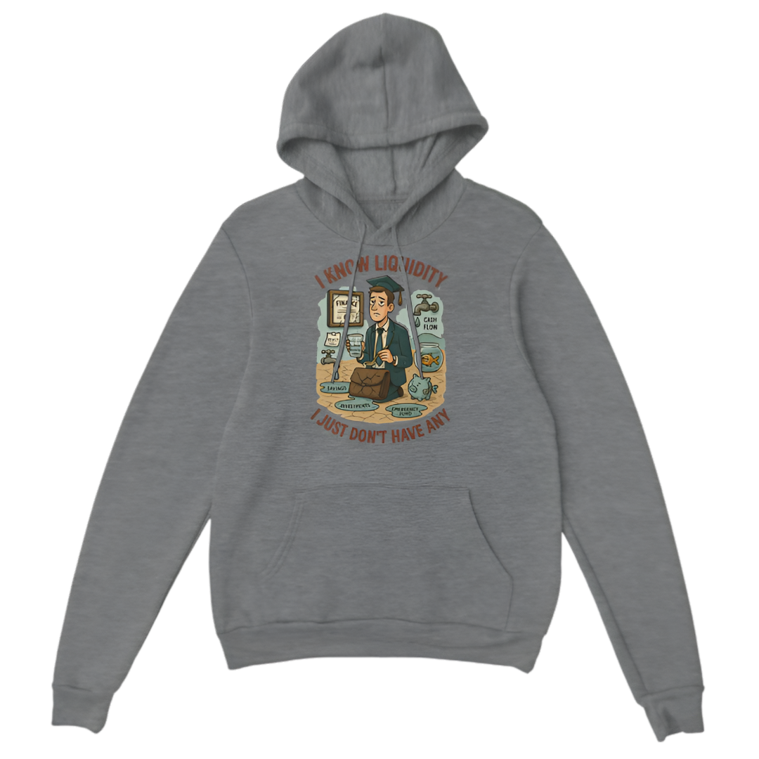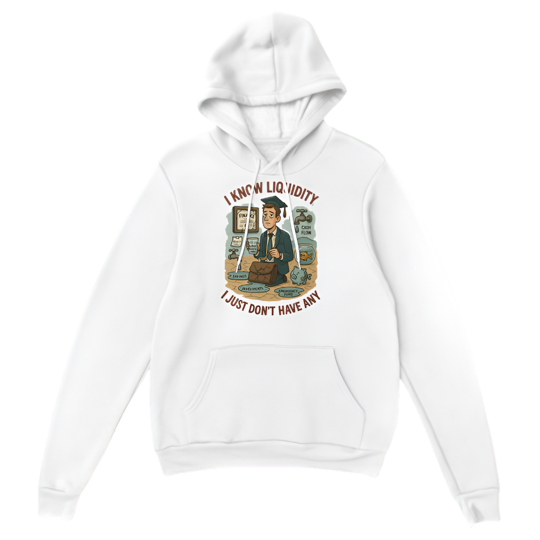 Stay warm with a dose of finance humor in this “I know liquidity. I just don’t have any” hoodie from the Broke Banker collection. Perfect for anyone fluent in financial jargon but feeling the cash crunch. Made from soft, cozy fabric, this hoodie balances comfort and clever wit effortlessly.