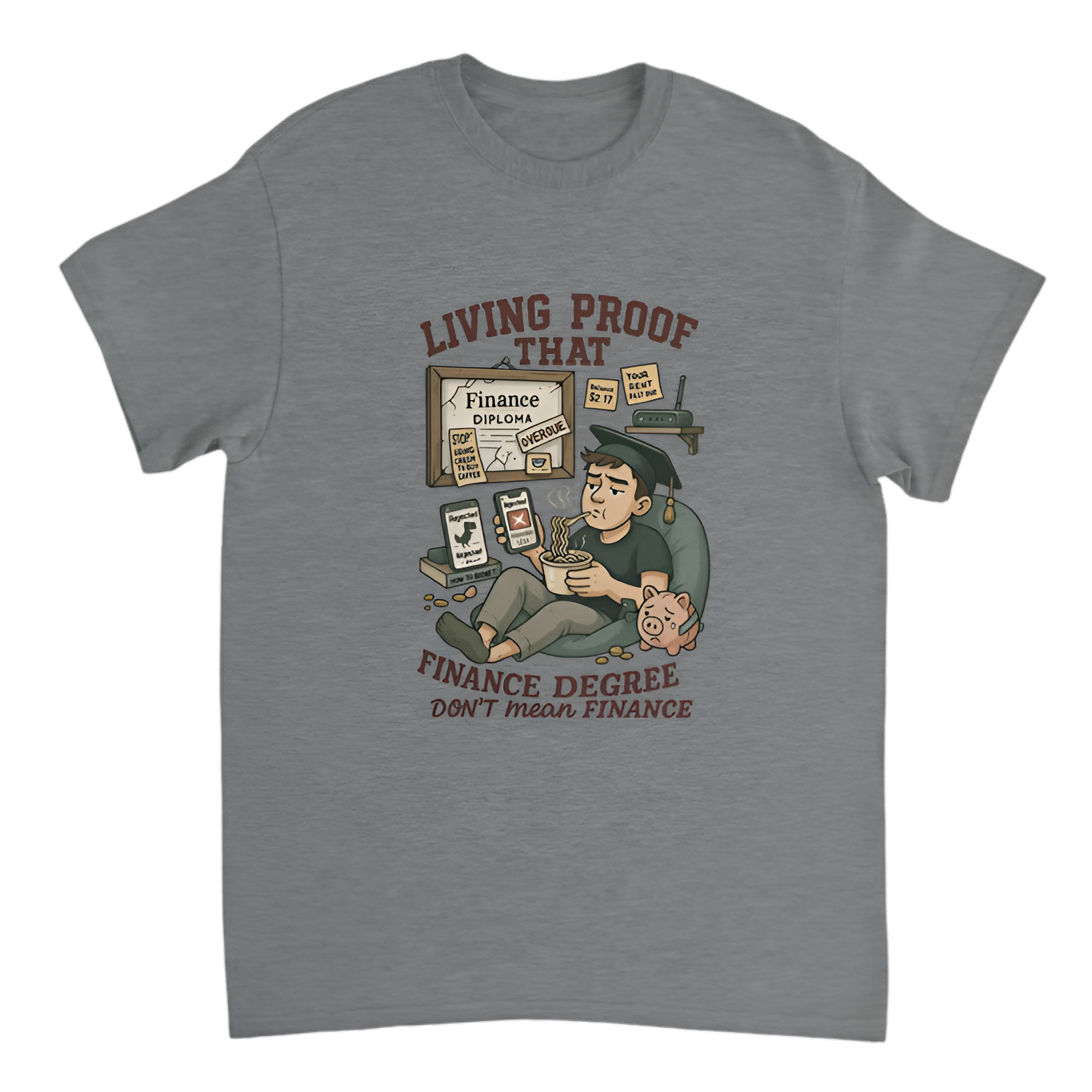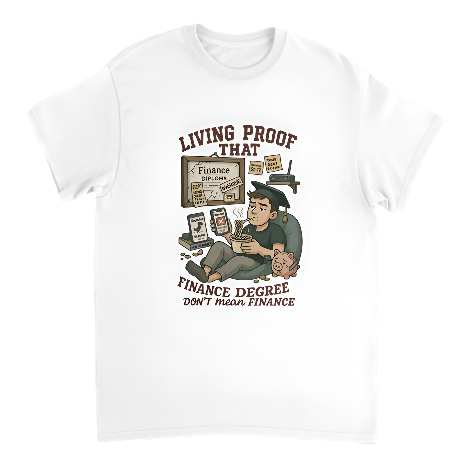 Celebrate the reality behind the diploma with this witty “Living proof that finance degrees don’t mean finance” t-shirt from the Broke Banker series. Perfect for anyone who’s learned that a degree doesn’t guarantee financial success. Made from soft, breathable fabric, this tee is as comfortable as it is honest.