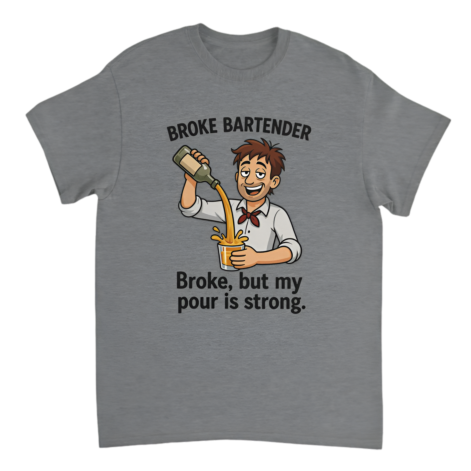 broke bartender t-shirt, funny bartender shirt, broke but strong pour shirt, cartoon bartender tee, bartender humor apparel, bartender life t-shirt, novelty bar shirt, ironic bartender gift, messy bartender cartoon shirt, bartender shift humor