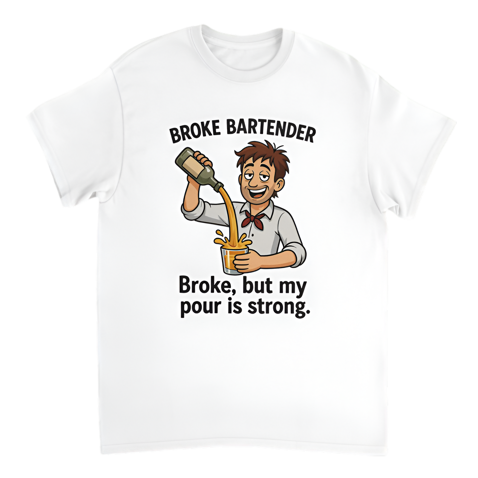 Introducing the “Broke Bartender” who may be down on cash but never short on pour. This cartoon-style tee features a hilariously disheveled bartender with messy hair, under-eye circles, and a chaotic grin as he floods a glass with liquor like a pro. With a loose bowtie, untucked shirt, and unstoppable confidence, this design hits hard with the caption: “Broke, but my pour is strong.” It’s funny, ironic, and full of spirit—just like your favorite bartender.