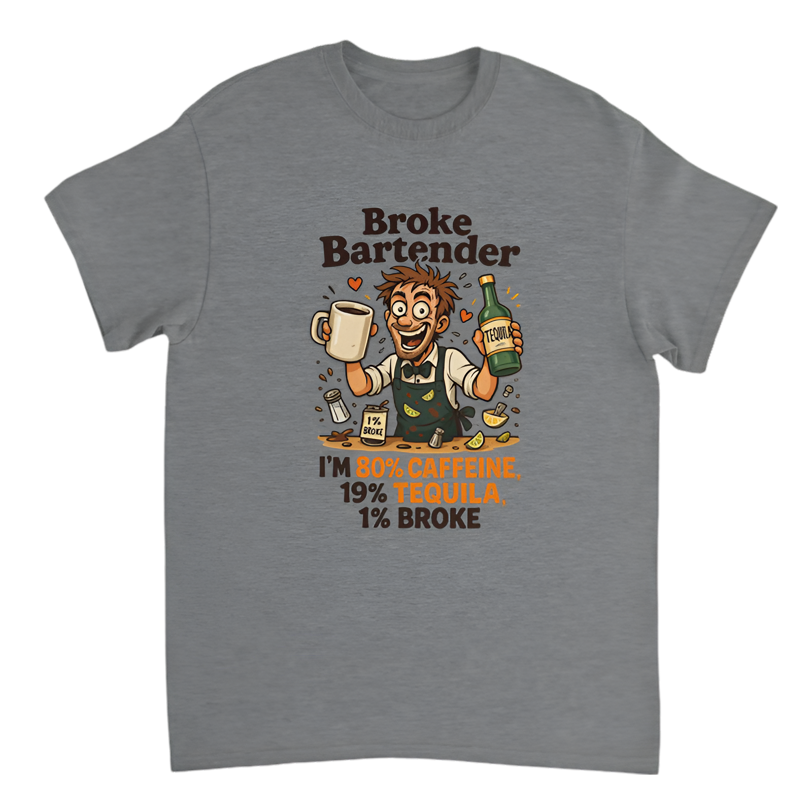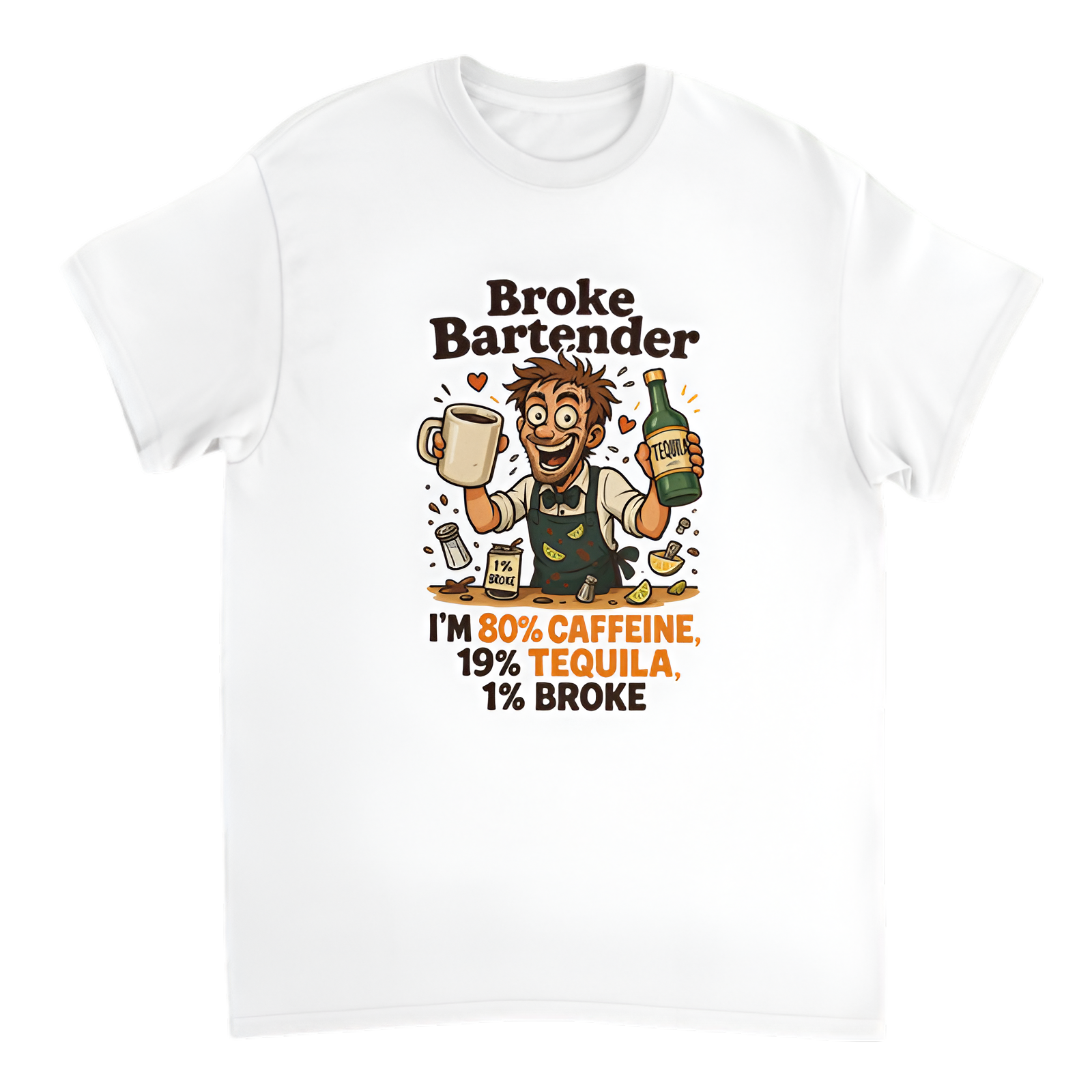 Meet the ultimate chaos cocktail: caffeine, tequila, and just a pinch of broke. This "Broke Bartender" tee brings the madness to life with a wild-eyed cartoon bartender juggling a coffee mug and tequila bottle like he hasn’t slept in days (because he hasn’t). Coffee stains, lime slices, jittery vibes, and a tip jar that screams “1% Broke” — this shirt is pure, caffeinated comedy. Bottom line? “I’m 80% Caffeine, 19% Tequila, 1% Broke.”