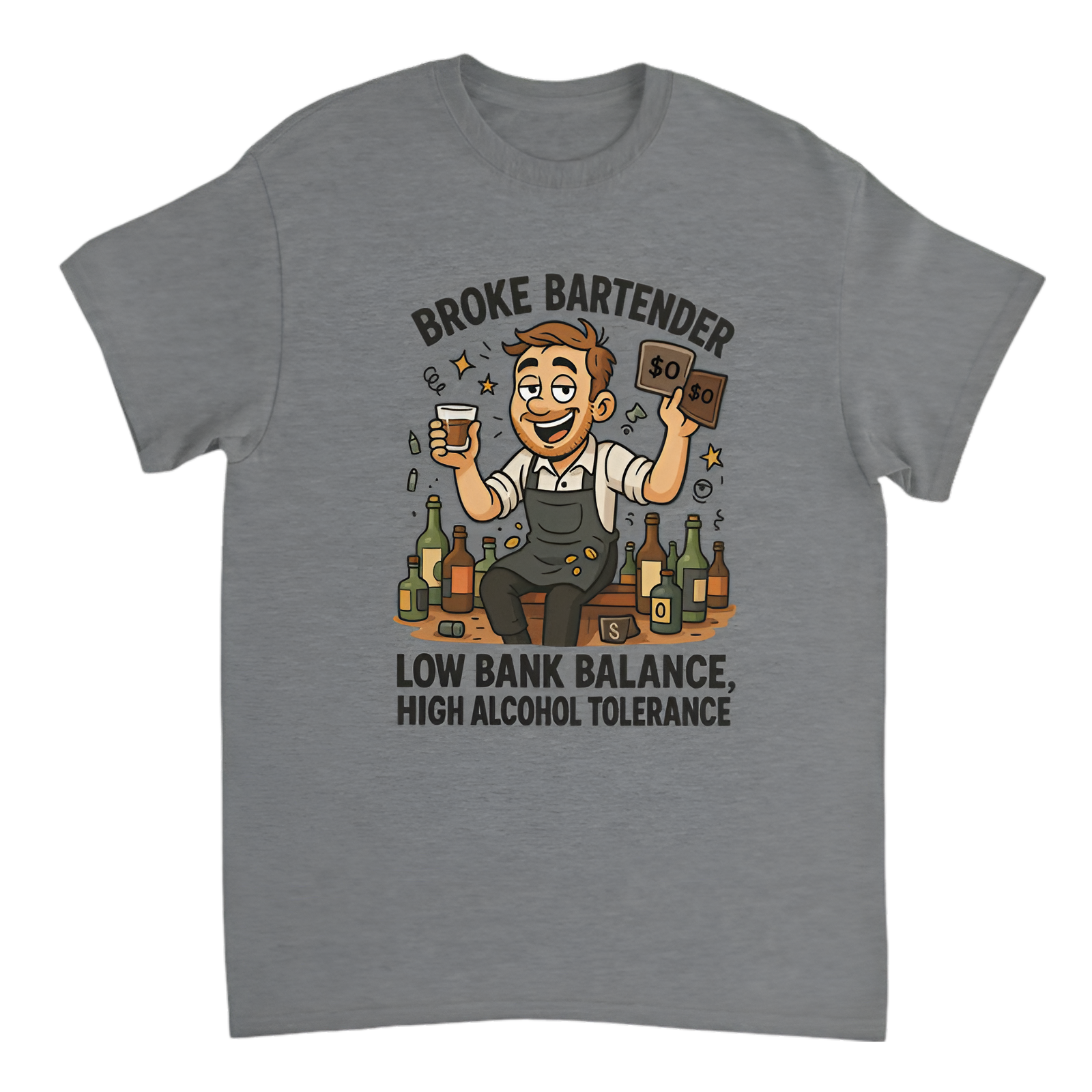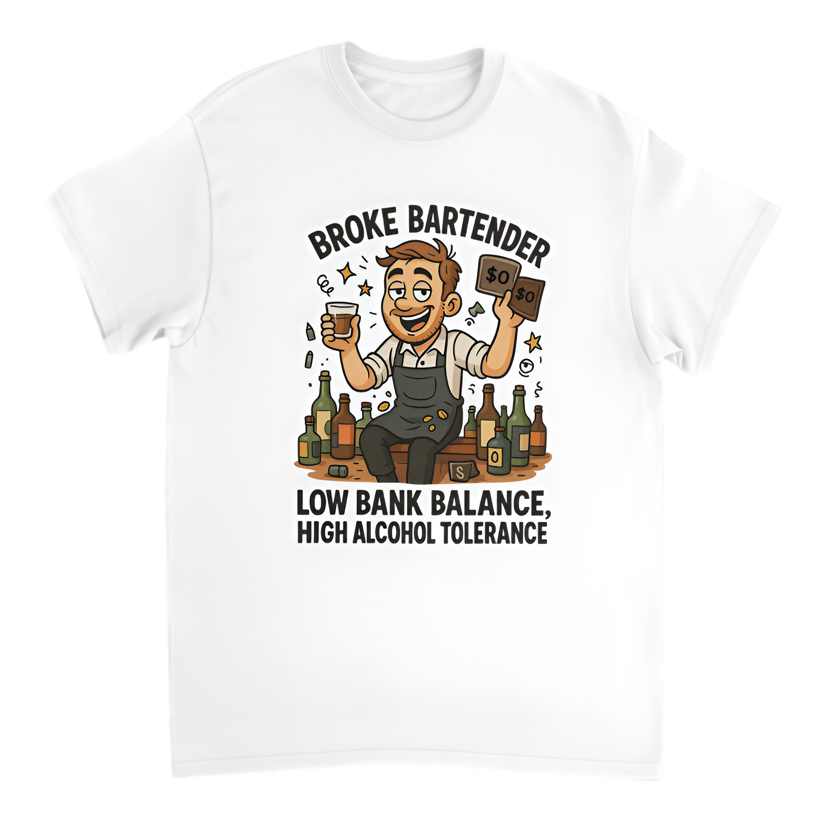 Celebrate being rich in spirit (literally) with this “Broke Bartender” tee! Featuring a cartoon bartender chilling on the bar, shot glass in one hand and an empty wallet in the other — complete with a bold “$0” floating overhead. Surrounded by bottles, loose coins, and tipsy doodles, he’s the poster child for “Low Bank Balance, High Alcohol Tolerance.” It’s the perfect mix of broke, boozy, and totally unbothered.