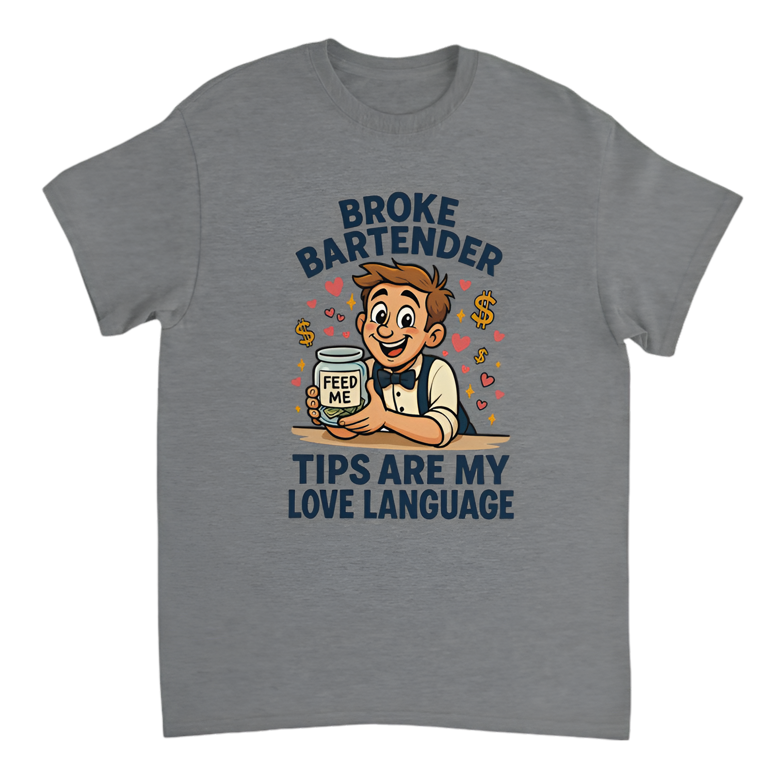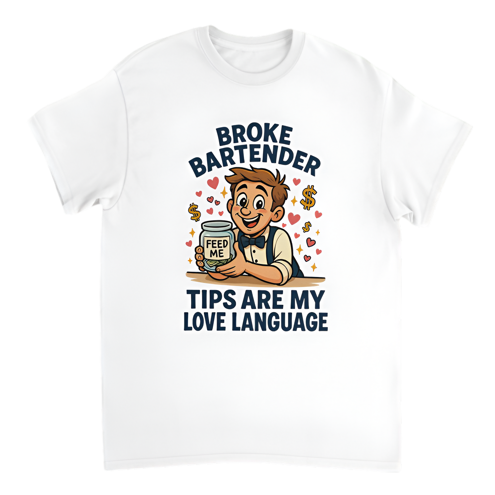 Meet the "Broke Bartender" who's pouring drinks and fishing for tips—with love! This cartoon-style tee features a goofy, love-struck bartender holding an almost-empty tip jar labeled “Feed Me”, surrounded by hearts, dollar signs, and playful sparkles. Dressed to charm in suspenders and a bowtie, his flirty grin and bold slogan “Tips Are My Love Language” say it all. A hilarious and relatable pick for anyone who’s ever worked for the tip jar.