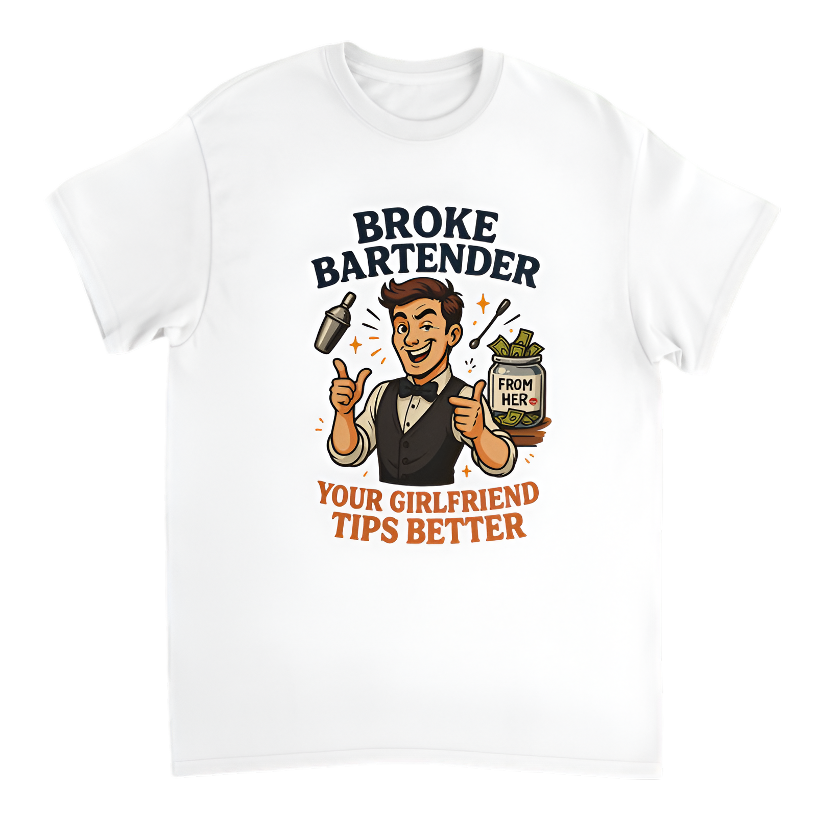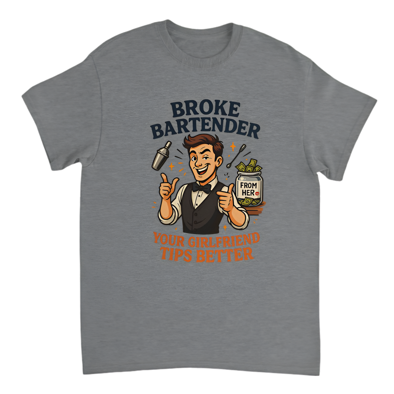 broke bartender t-shirt, your girlfriend tips better shirt, funny bartender shirt, sassy bar tee, confident bartender apparel, flirty bartender cartoon shirt, cocktail humor shirt, bartender tip jar design, nightlife novelty shirt, cheeky bartender gift
