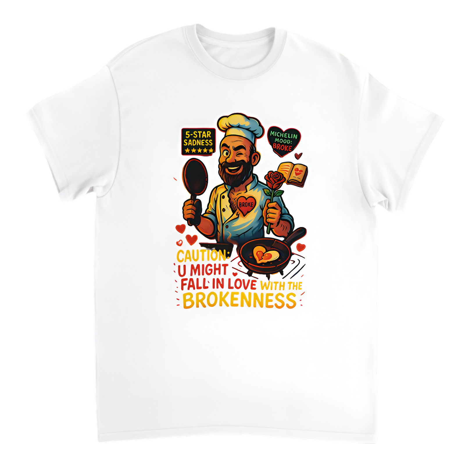 Fall head over heels for chaos with our “Caution: U Might Fall in Love with the Brokenness” tee from the Broke Chef series. This hilarious and heart-melting design features a bald, bearded kitchen rebel flaunting a cheeky heart tattoo and a burnt pan like it's a love letter. Set in a disaster of a kitchen where heartbreak meets humor, this T-shirt captures the sexy, scruffy side of culinary catastrophe. Available in white, grey, and black variants — each with a distinct vibe that makes brokenness look damn irresistible.