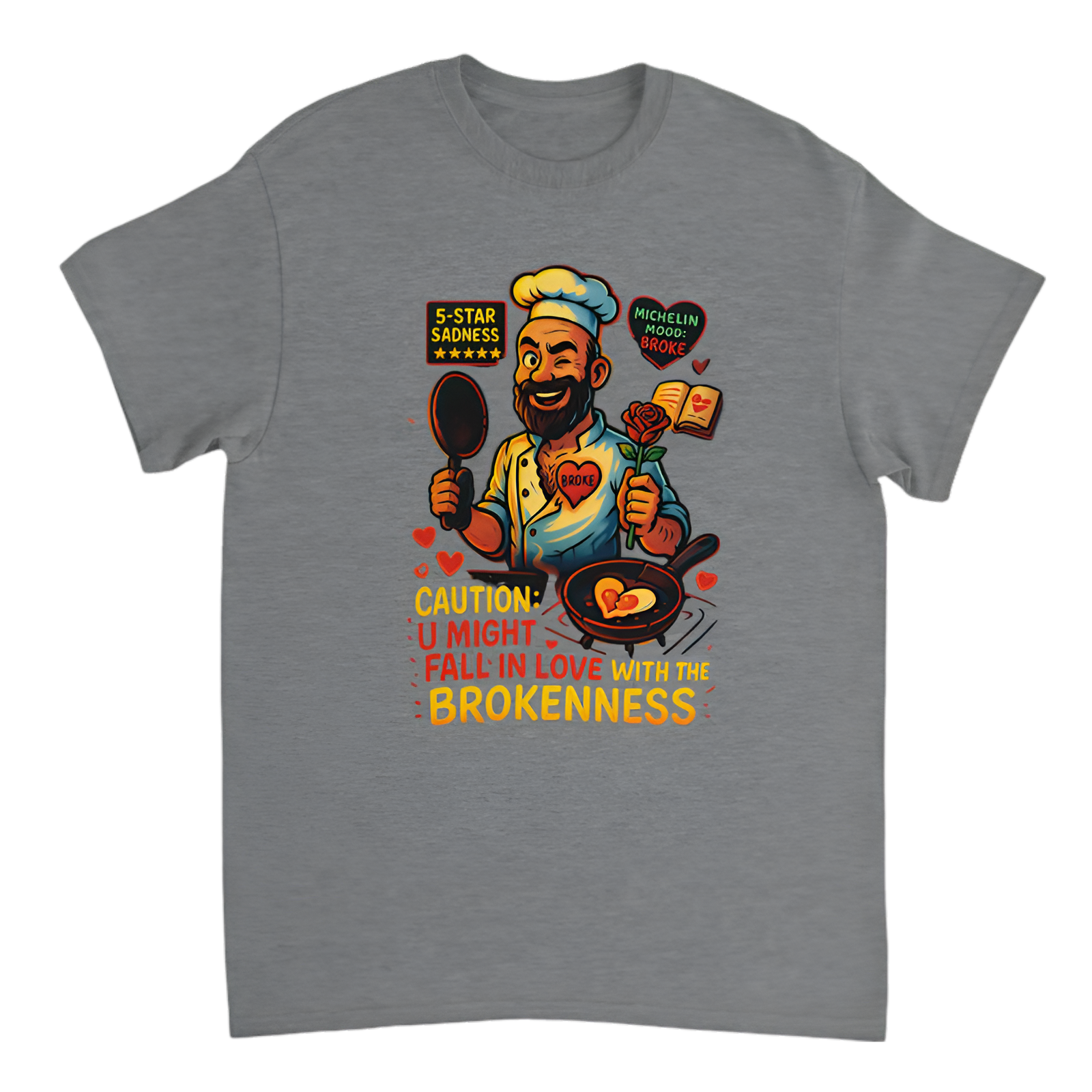 funny chef t-shirt, broke chef shirt, chef humor tee, scruffy chef graphic tee, cooking lover gift, bald chef t-shirt, heartbreak kitchen shirt, culinary comedy apparel, tattoo chef t-shirt, love and food funny shirt, messy kitchen t-shirt, sarcastic chef tee, heart-shaped egg design shirt, “Caution U might fall in love with the brokenness” t-shirt