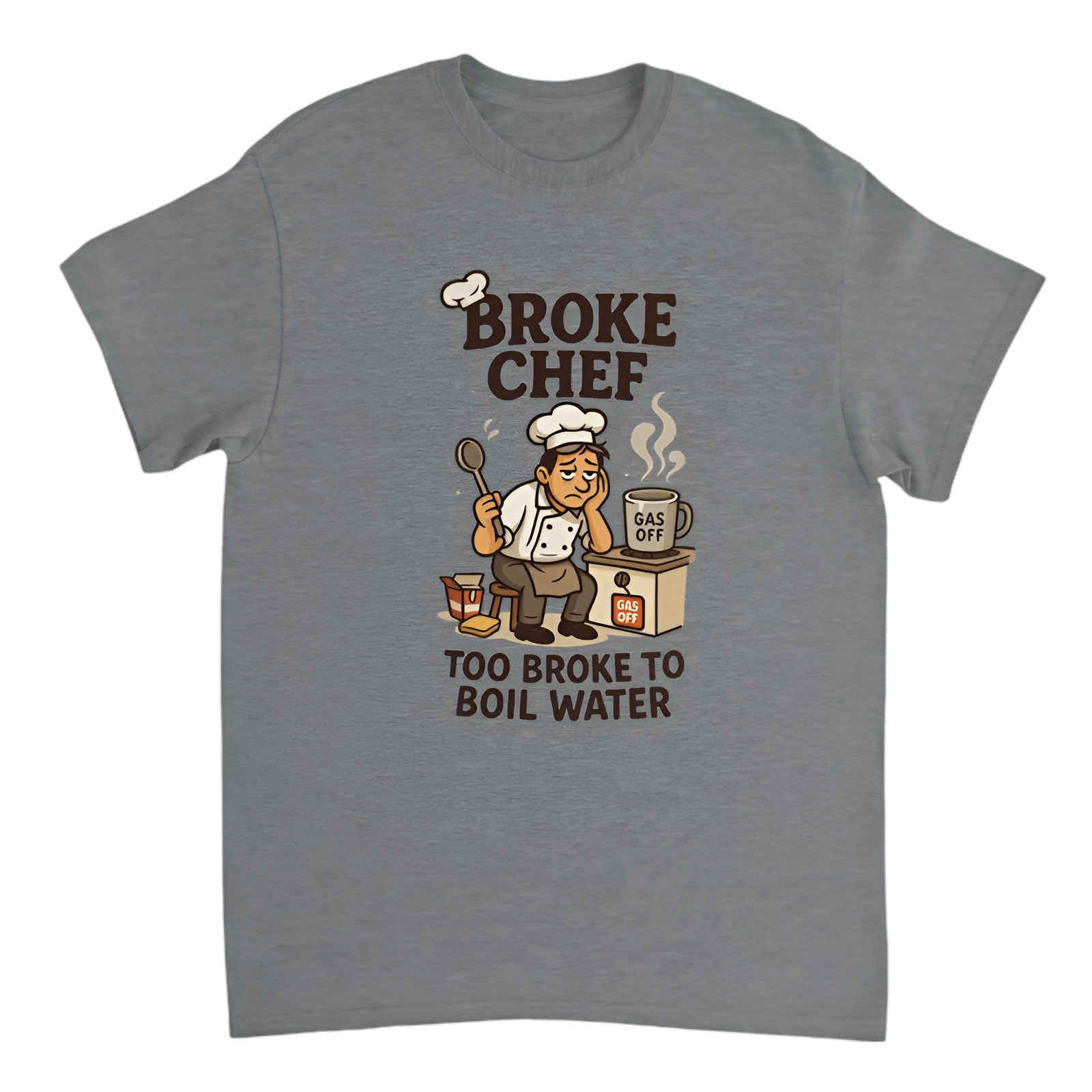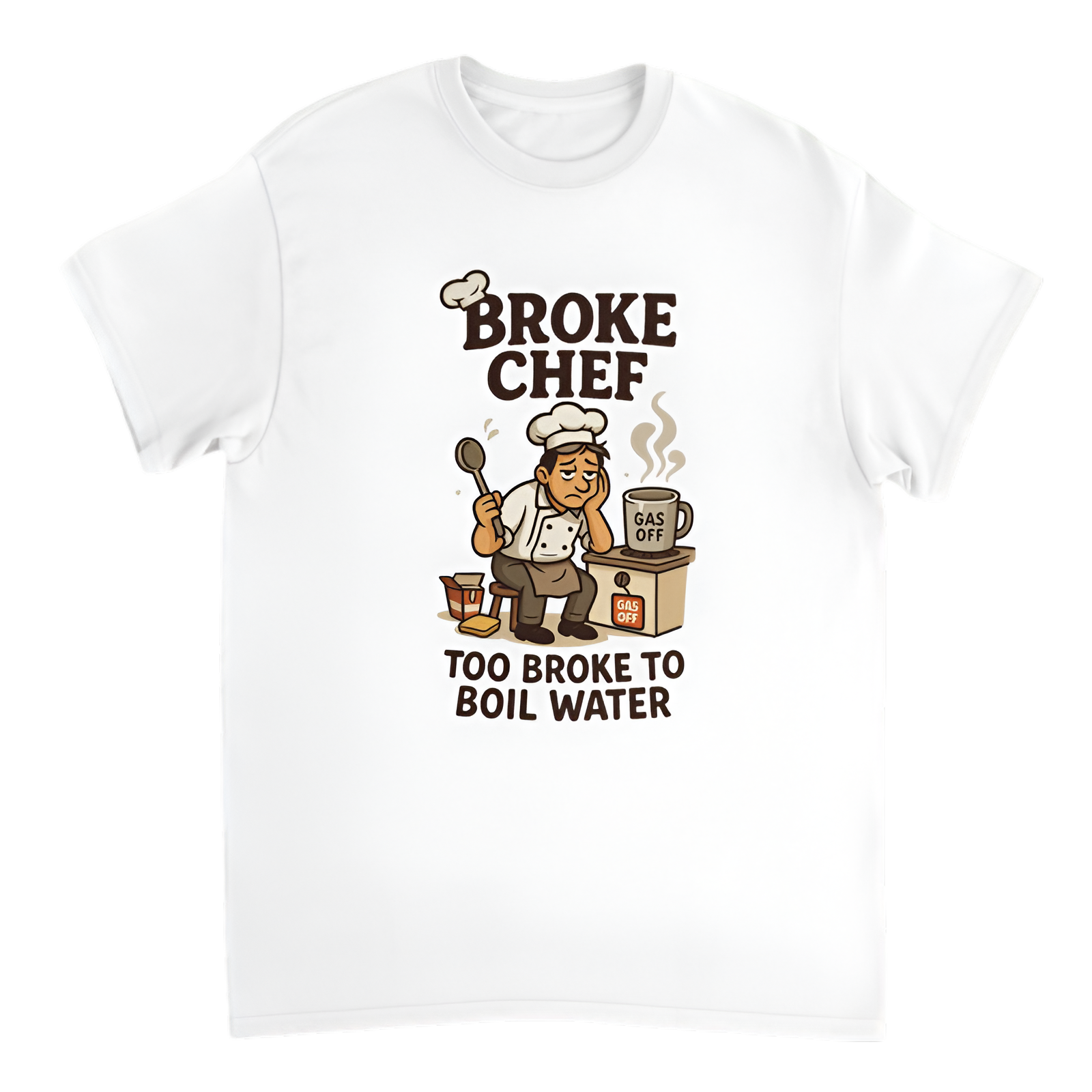 funny broke t-shirt, budget living shirt, kitchen humor tee, Broke Chef Apparel, relatable cooking shirt, broke chef tee, humorous life struggles shirt