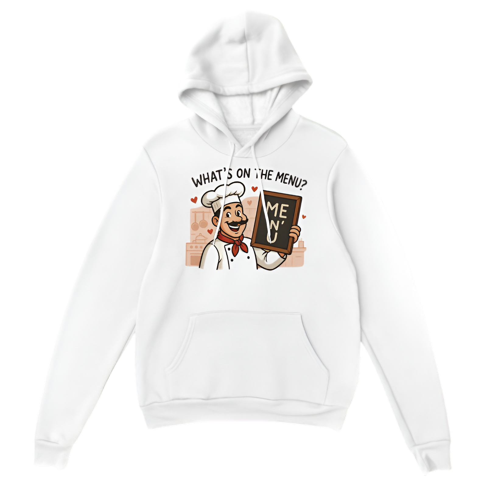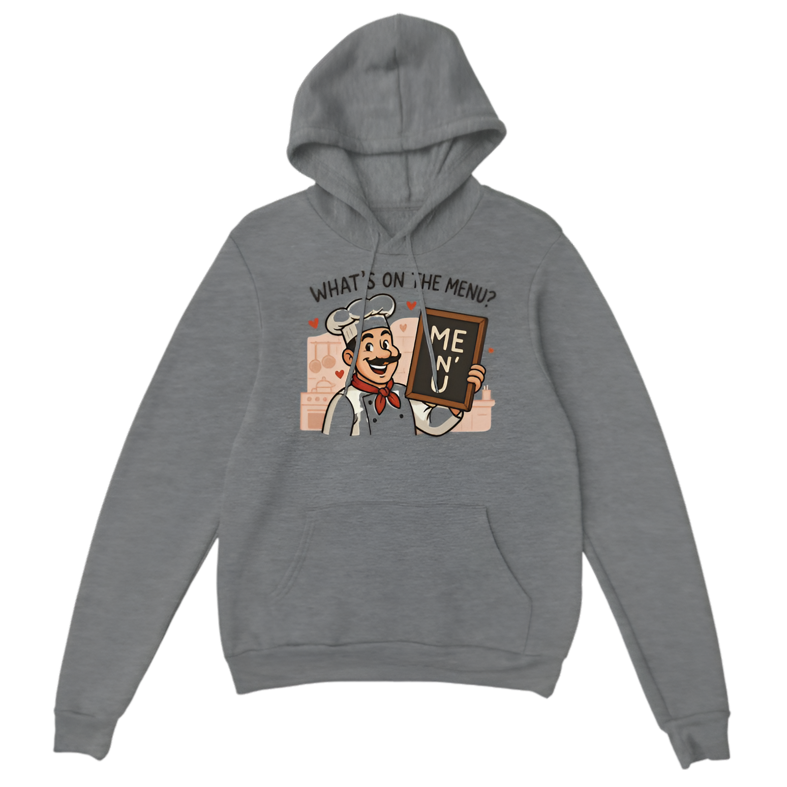 Flirty hoodie, Playful slogan sweatshirt, Funny date night hoodie, Bold statement hoodie, Cheeky fashion hoodie, Playful personality apparel, What’s on the menu hoodie, Fun and flirty sweatshirt