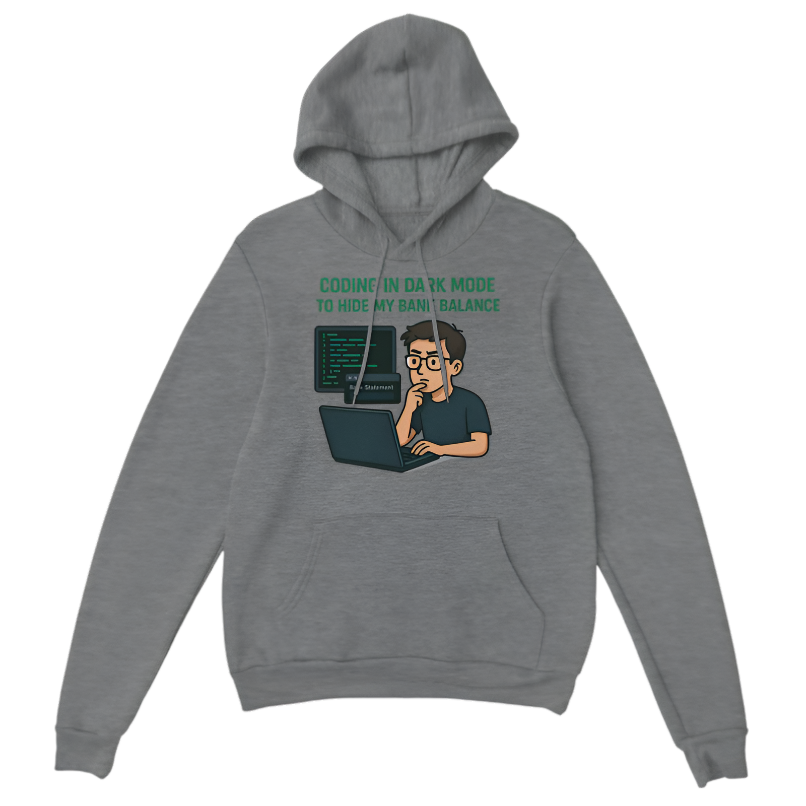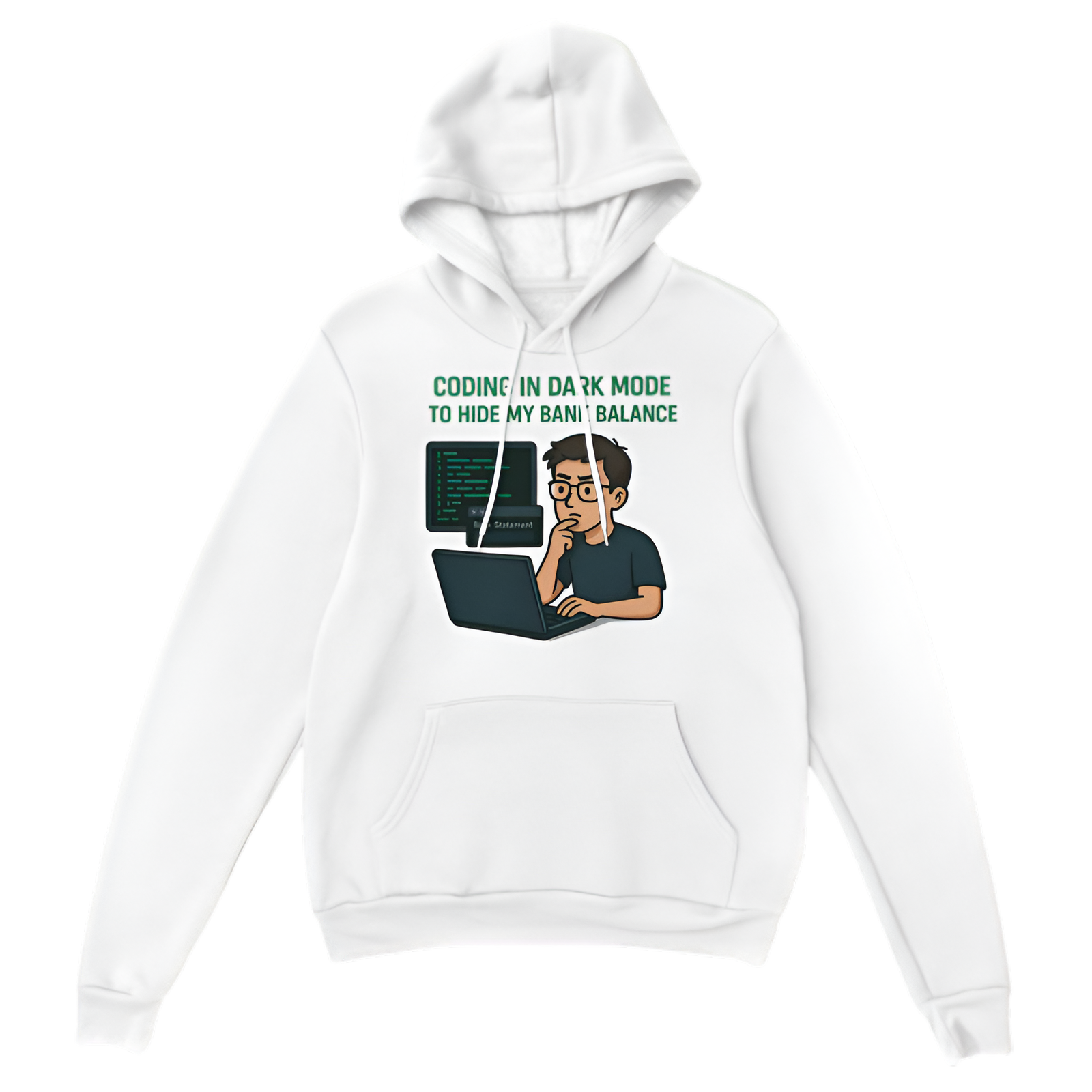 Stay cozy and keep your finances as mysterious as your screen with this “Coding in dark mode to hide my bank balance” hoodie. Perfect for developers who prefer dark mode coding and have a sense of humor about their wallet. Made with soft, warm fabric, it’s ideal for late-night coding or casual outings.