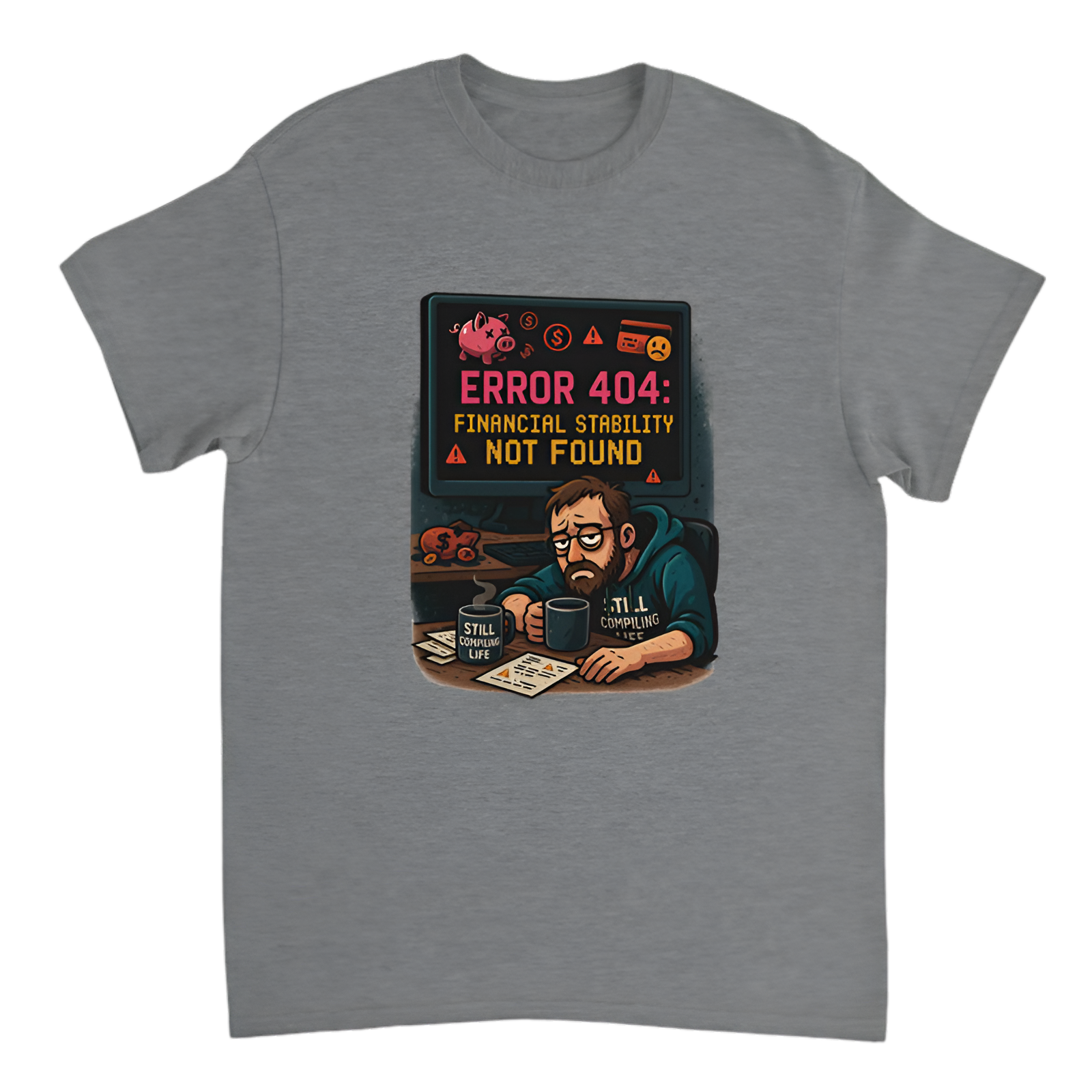 error 404 t-shirt, financial stability not found shirt, funny broke developer tee, coder error code humor, tech meme apparel, white and grey programmer shirt, software engineer gift, coding joke t-shirt, internet humor shirt, broke dev lifestyle tee