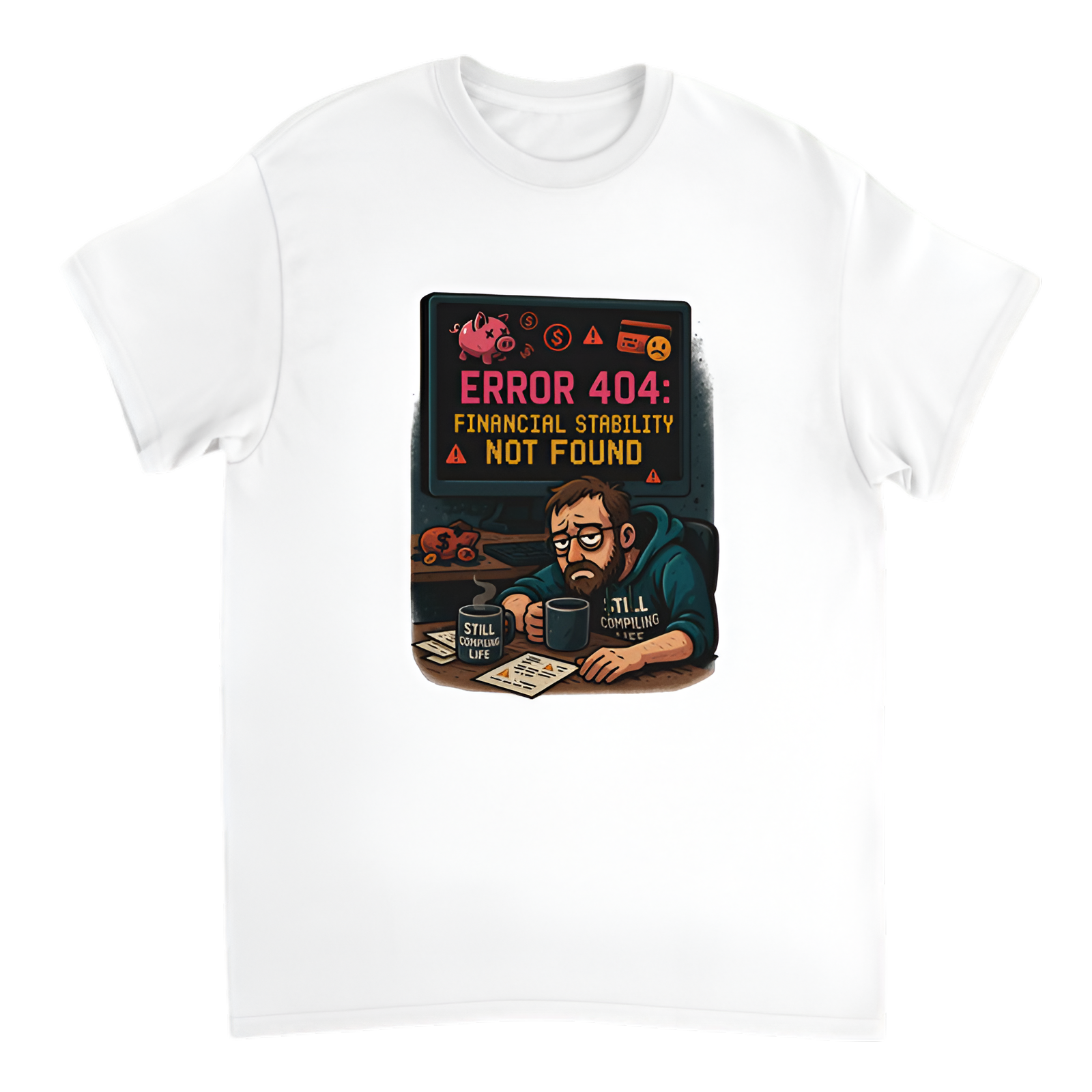 Your code compiles, your app runs… but your finances? Missing in action. This T-shirt is a perfect mashup of classic internet humor and harsh financial reality. “Error 404: Financial stability not found” is the go-to shirt for devs who live in the console more than their savings account. Sarcastic, sharp, and painfully real.