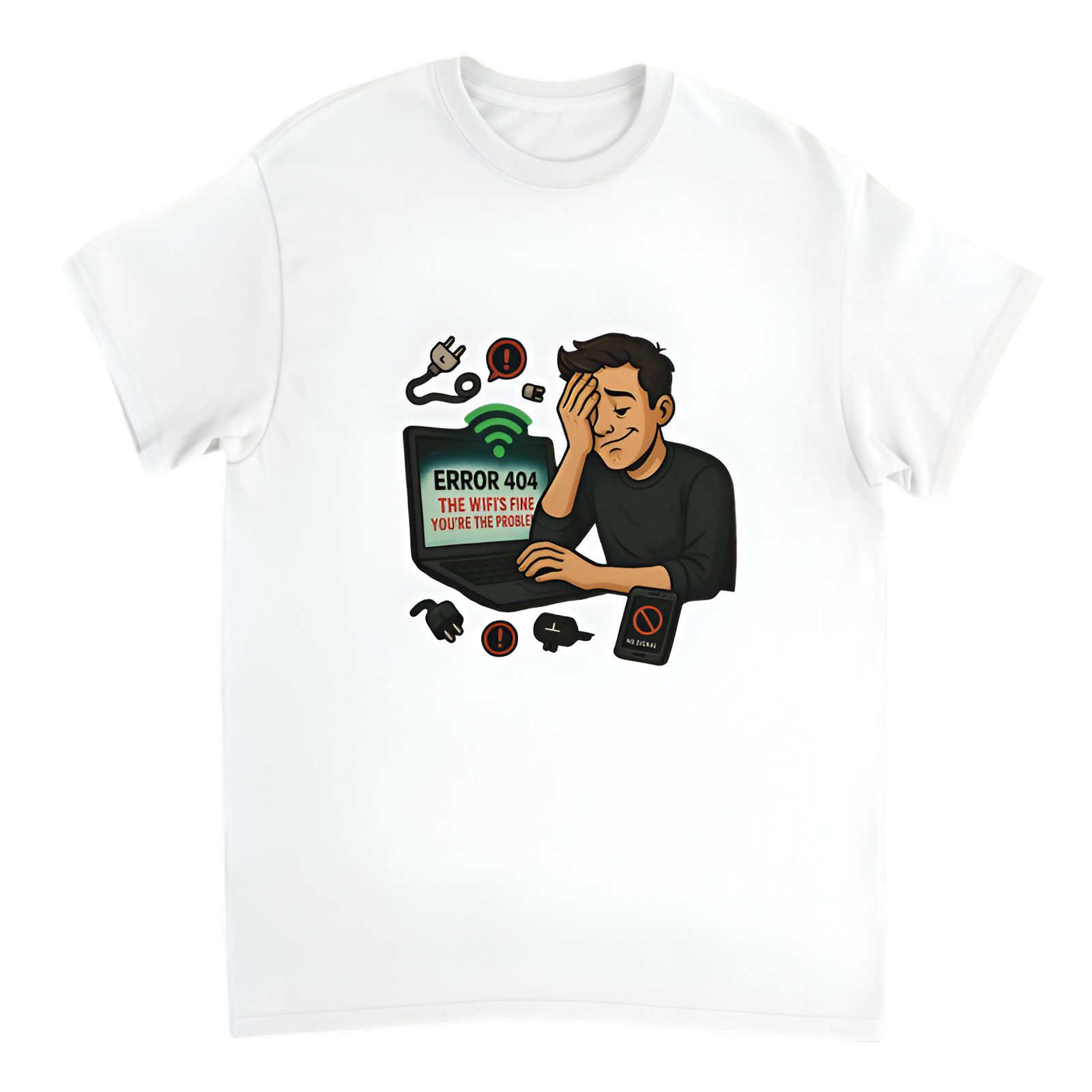 Blame the router all you want—this "Error 404: The Wi-Fi’s fine. You’re the problem" t-shirt sets the record straight with brutal honesty and hilarious flair. Made from ultra-soft, breathable cotton, this tee is perfect for tech lovers, IT workers, or anyone tired of troubleshooting user errors. Serve up some truth with style, one awkward pause at a time.