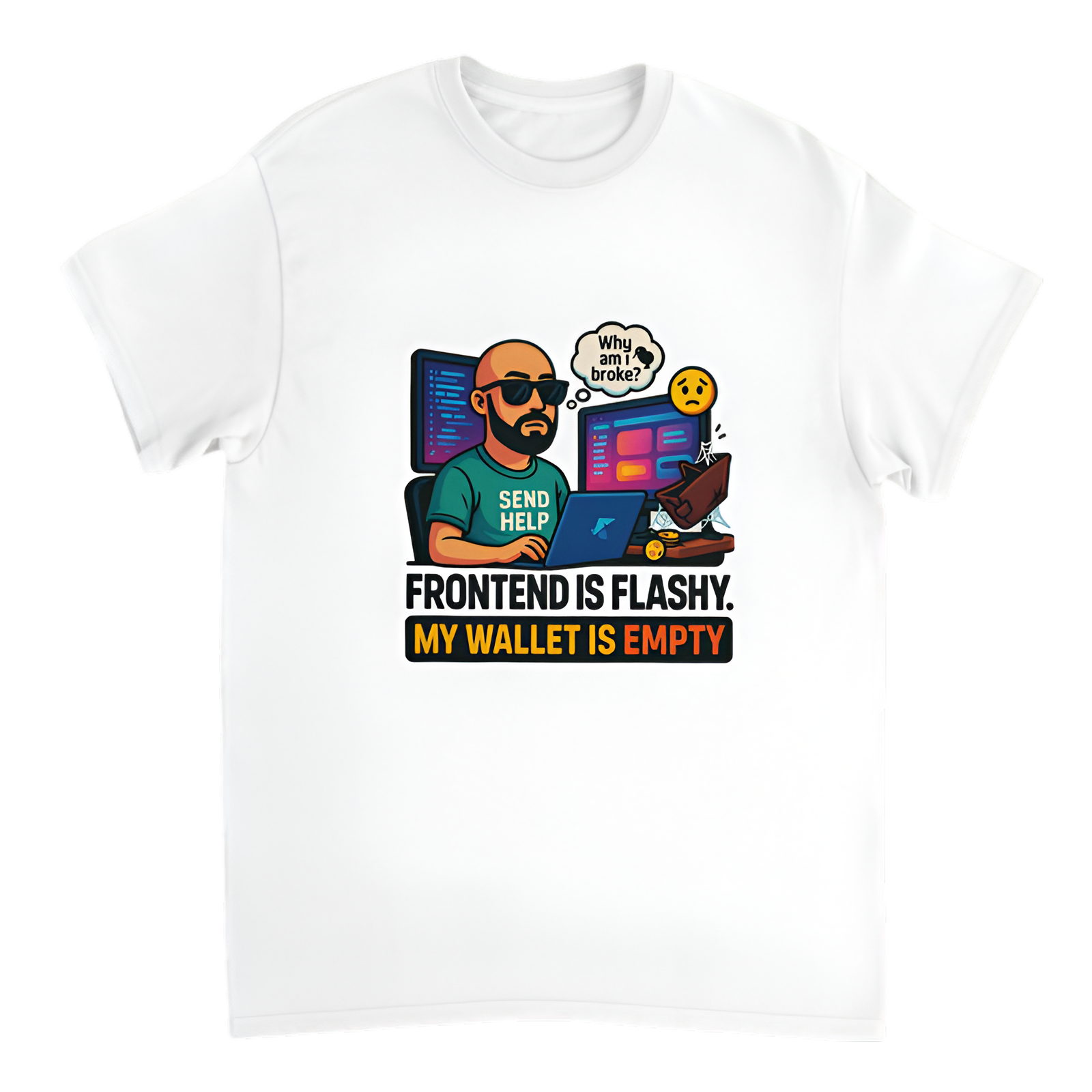 Your UI may sparkle, but your wallet’s throwing a 204 — no content. This T-shirt is the perfect drip for frontend devs living paycheck to paycheck while making the internet look pretty. Bold, sarcastic, and brutally honest—just like your last code review. Ideal for those who make magic on screen but can't summon cash IRL.
