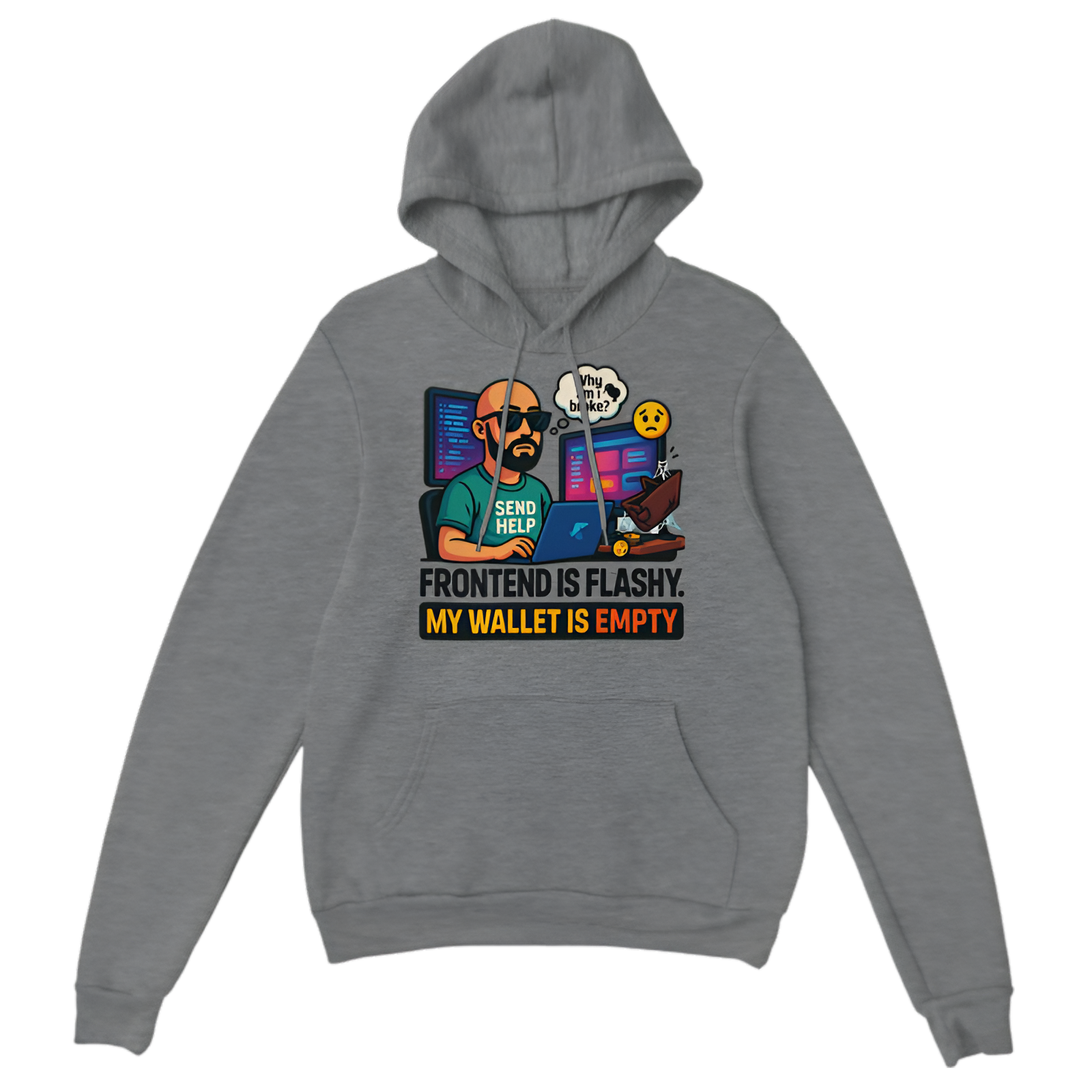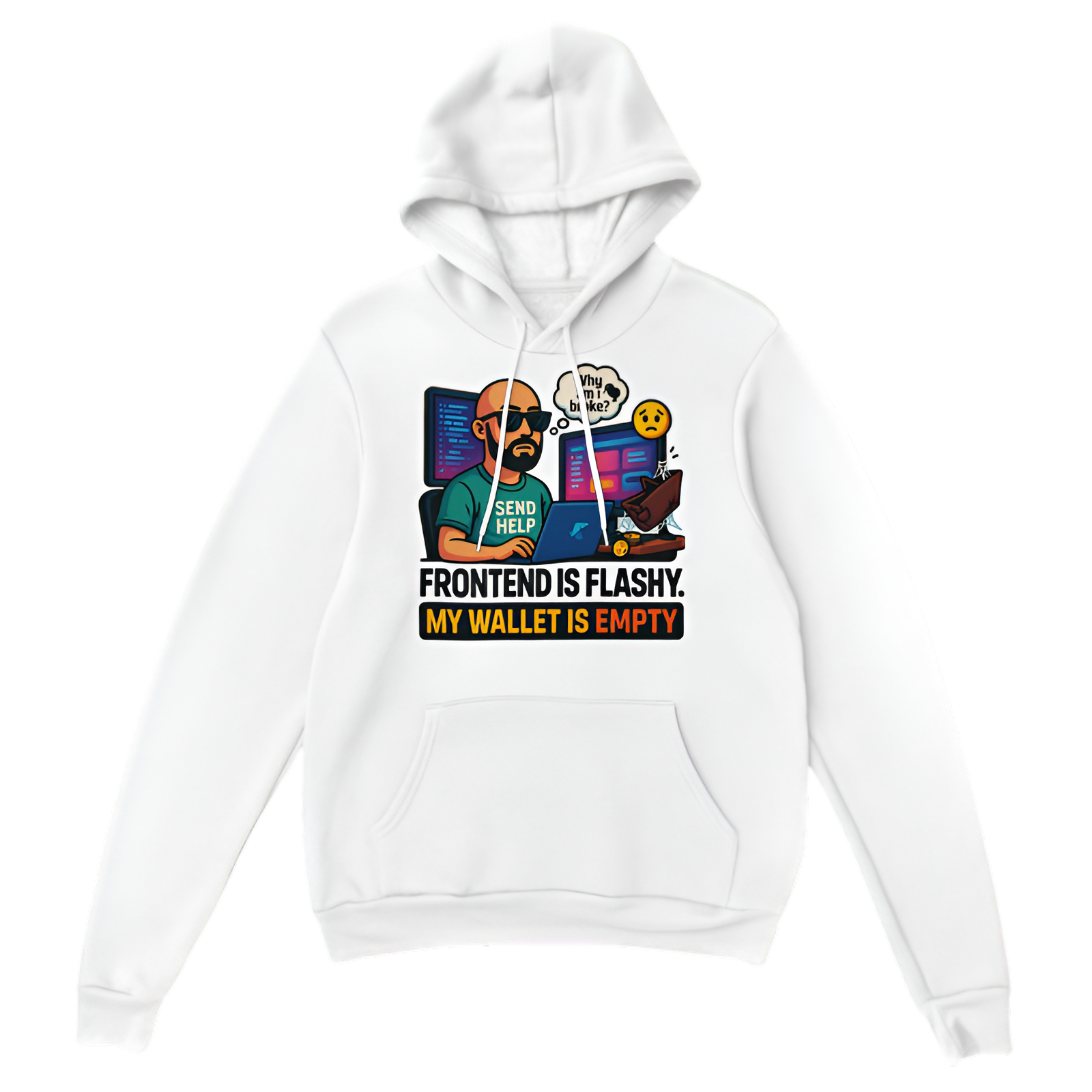 Your UI might shine, but your wallet? Not so much. The "Frontend is flashy. My wallet is empty" hoodie is a perfect mix of clean design humor and financial reality for devs who make things look amazing—but aren’t paid accordingly. Soft, warm, and built for long dev sessions, this hoodie lets you flex your frontend pride with a side of broke energy.