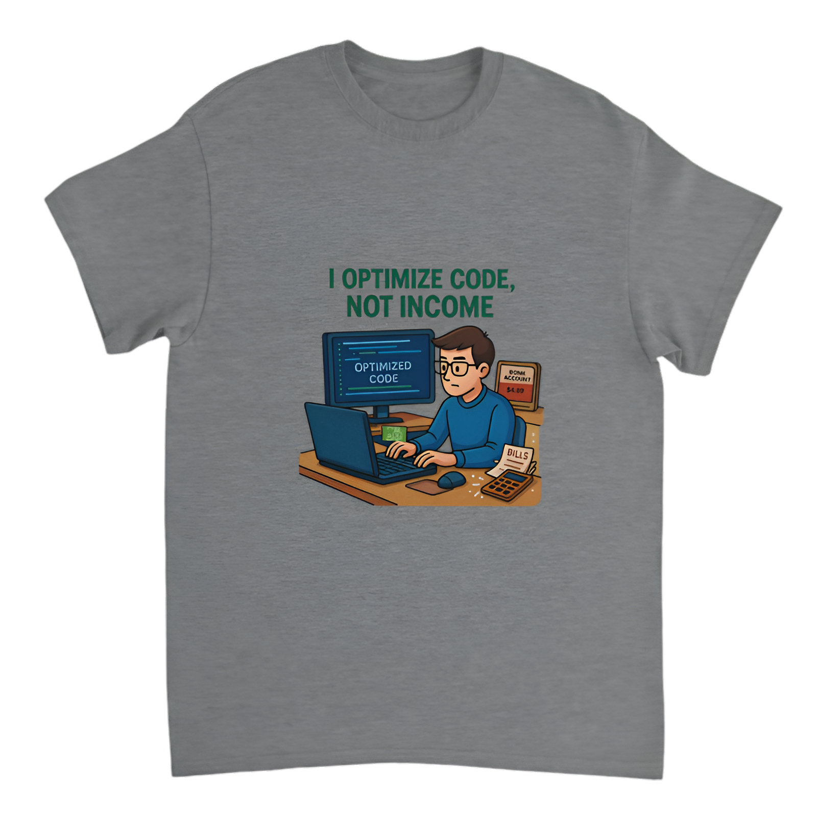 optimize code shirt, software developer humor, coding joke tee, programmer gift, tech humor t-shirt, broke coder apparel, funny developer shirt, income joke tee, coder lifestyle shirt, tech professional gift