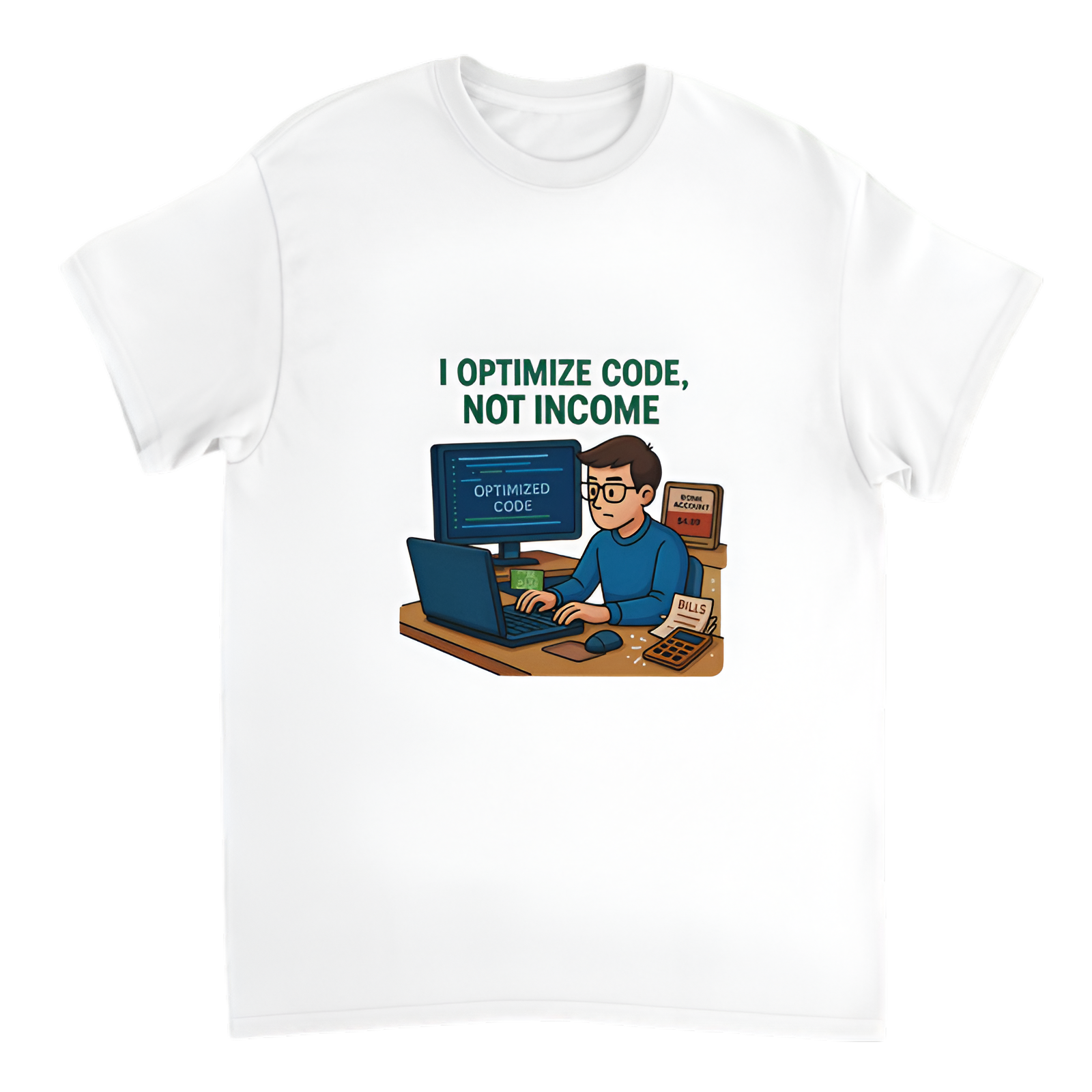 Show off your coder pride with this clever “I optimize code, not income” t-shirt. Perfect for software developers who pour their energy into clean, efficient code but wish their paycheck was just as optimized. Made with soft, breathable fabric, this tee is designed for comfort whether you're debugging, coding, or just relaxing.