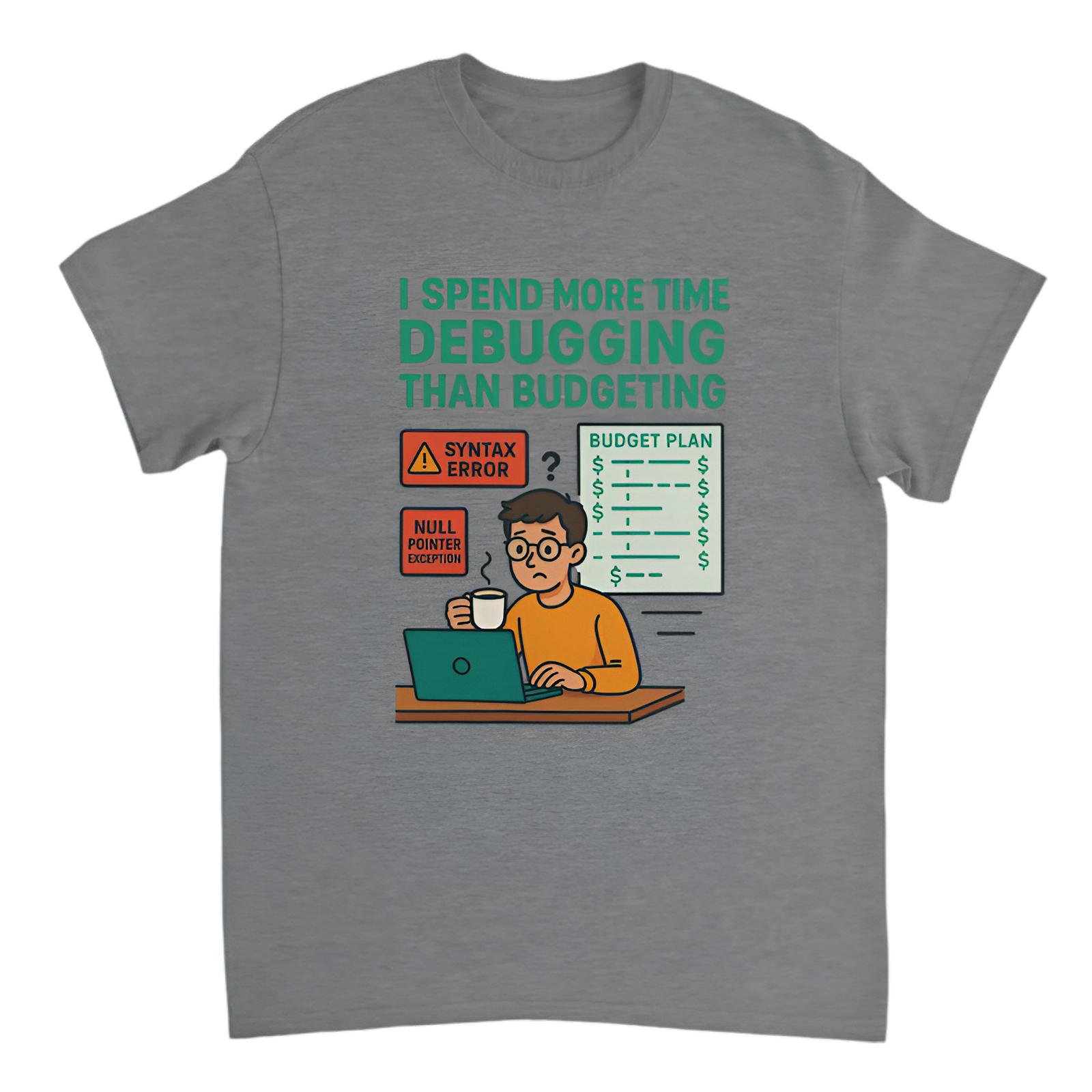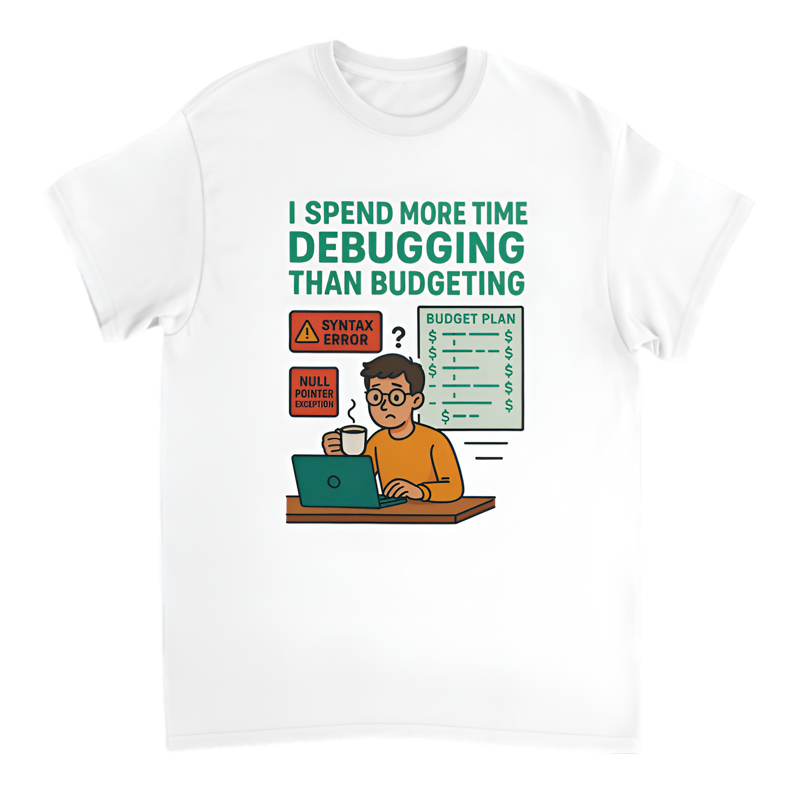 For the coder who knows the struggle of balancing work and finances, this “I spend more time debugging than budgeting” t-shirt is the perfect mix of humor and honesty. Made with soft, breathable fabric, this tee offers comfort during long coding sessions or casual hangouts. Let everyone know your priorities—and your wallet’s—aren’t quite aligned!
