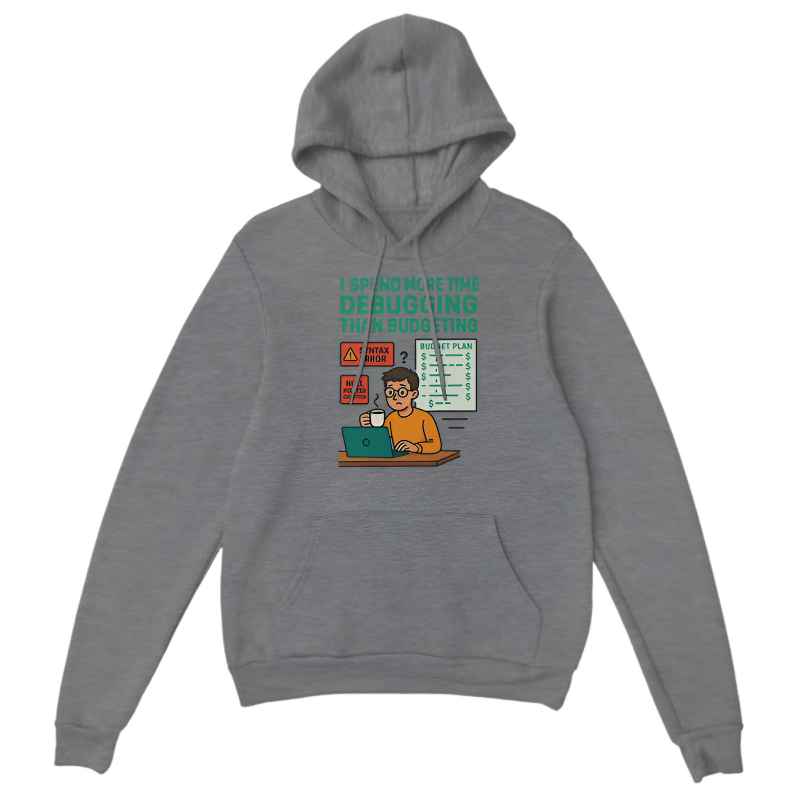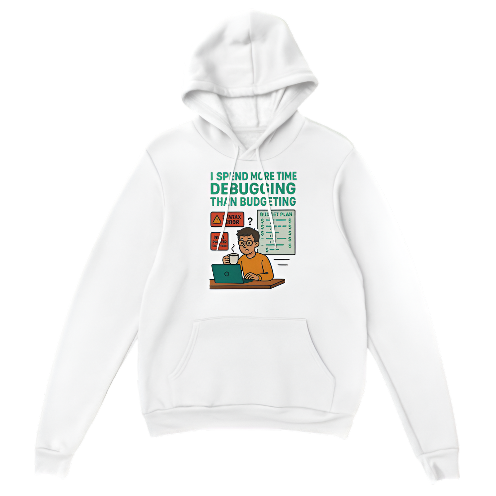 For those who find debugging code easier than managing finances, this “I spend more time debugging than budgeting” hoodie is a hilarious and cozy way to express your coder struggles. Made from soft, warm fabric, it’s perfect for chilly days spent coding or just relaxing while embracing the humor of a developer’s life.