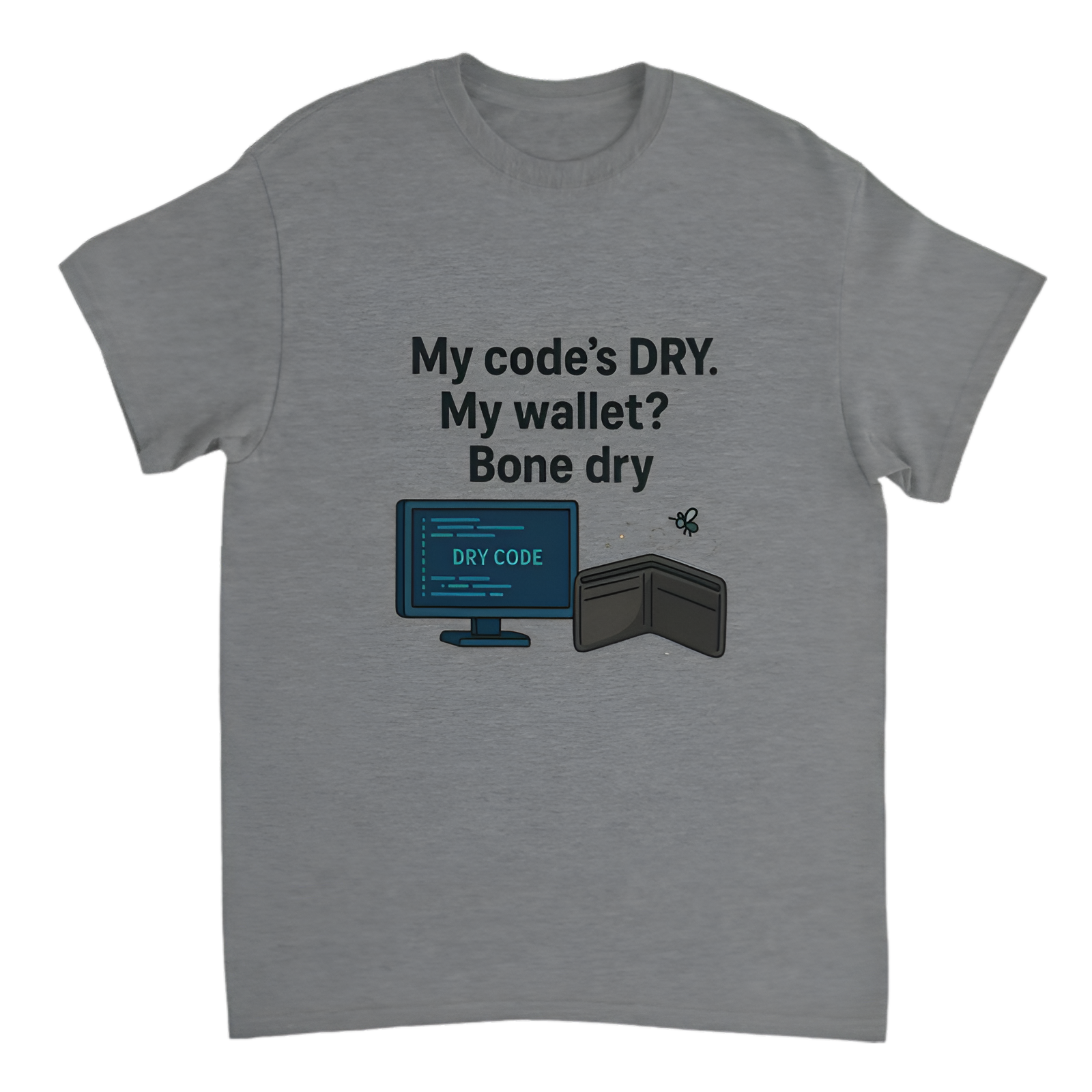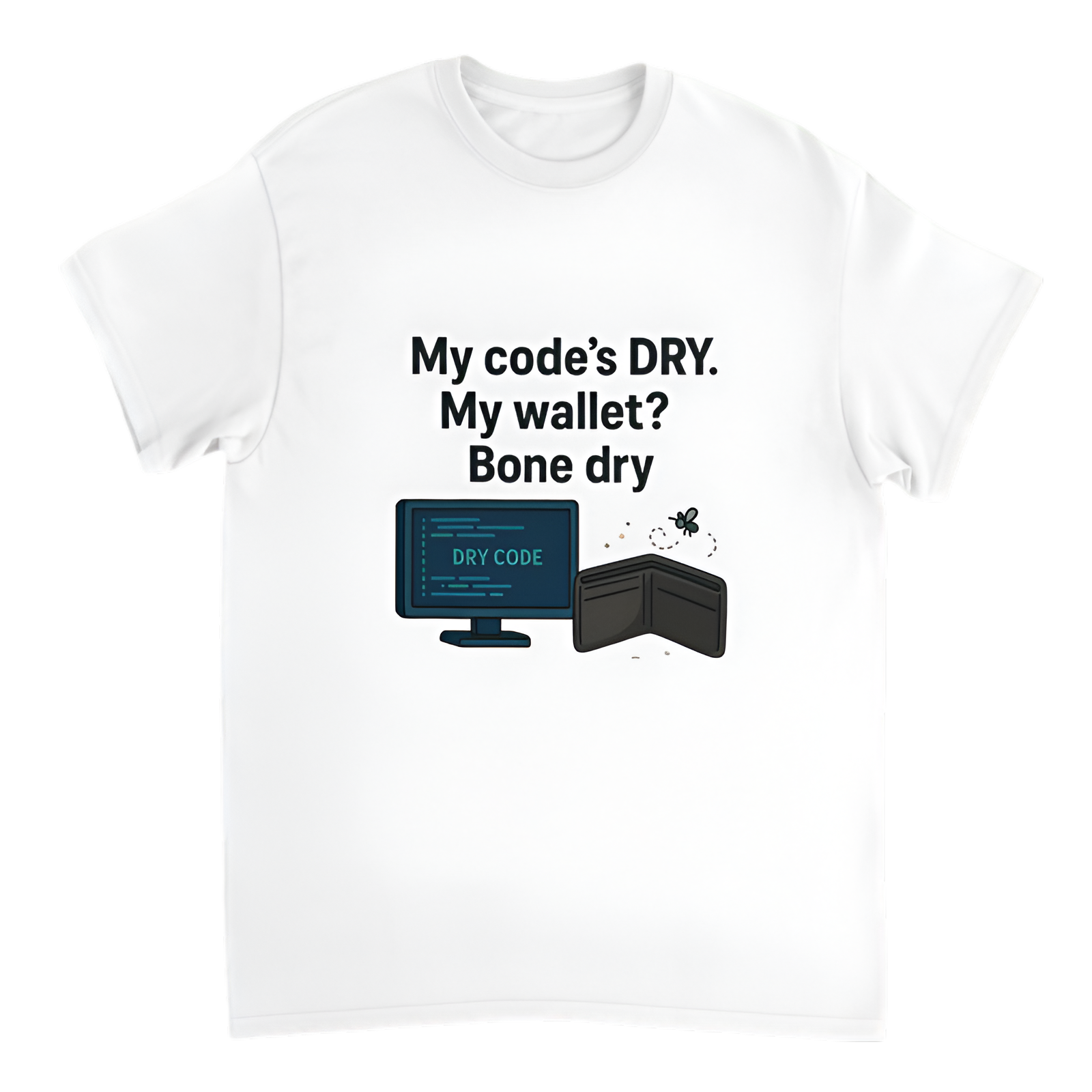 DRY code shirt, coder humor t-shirt, programmer joke tee, software developer gift, funny tech shirt, broke coder apparel, wallet joke t-shirt, developer lifestyle shirt, coding humor tee, programmer apparel