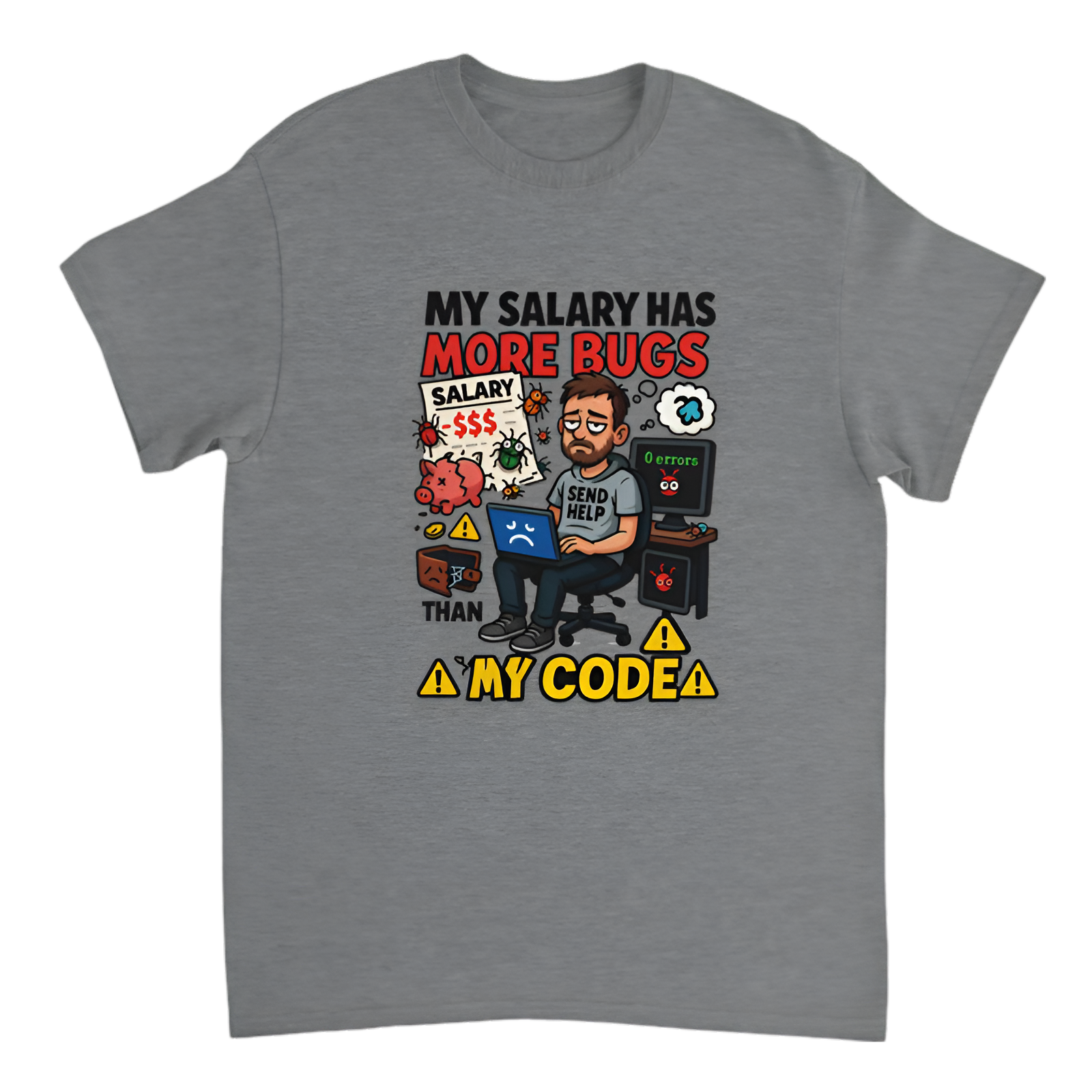 funny developer t-shirt, broke coder tee, salary bug joke shirt, programming humor t-shirt, underpaid software engineer shirt, tech sarcasm apparel, white and grey coder tee, funny salary quote shirt, debugging life t-shirt, dev life humor merch