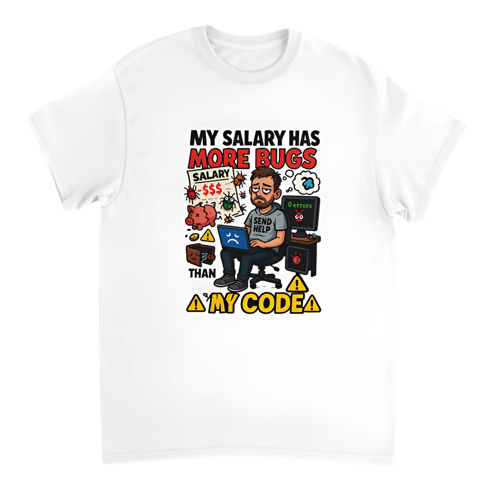 Clean code, dirty paycheck. If your salary slips through the cracks faster than a semicolon in production, this T-shirt speaks your truth. Designed for developers who can fix infinite loops but not the loop of underpayment, it's sarcasm wrapped in soft, breathable cotton. Wear it with pride—or passive-aggression.