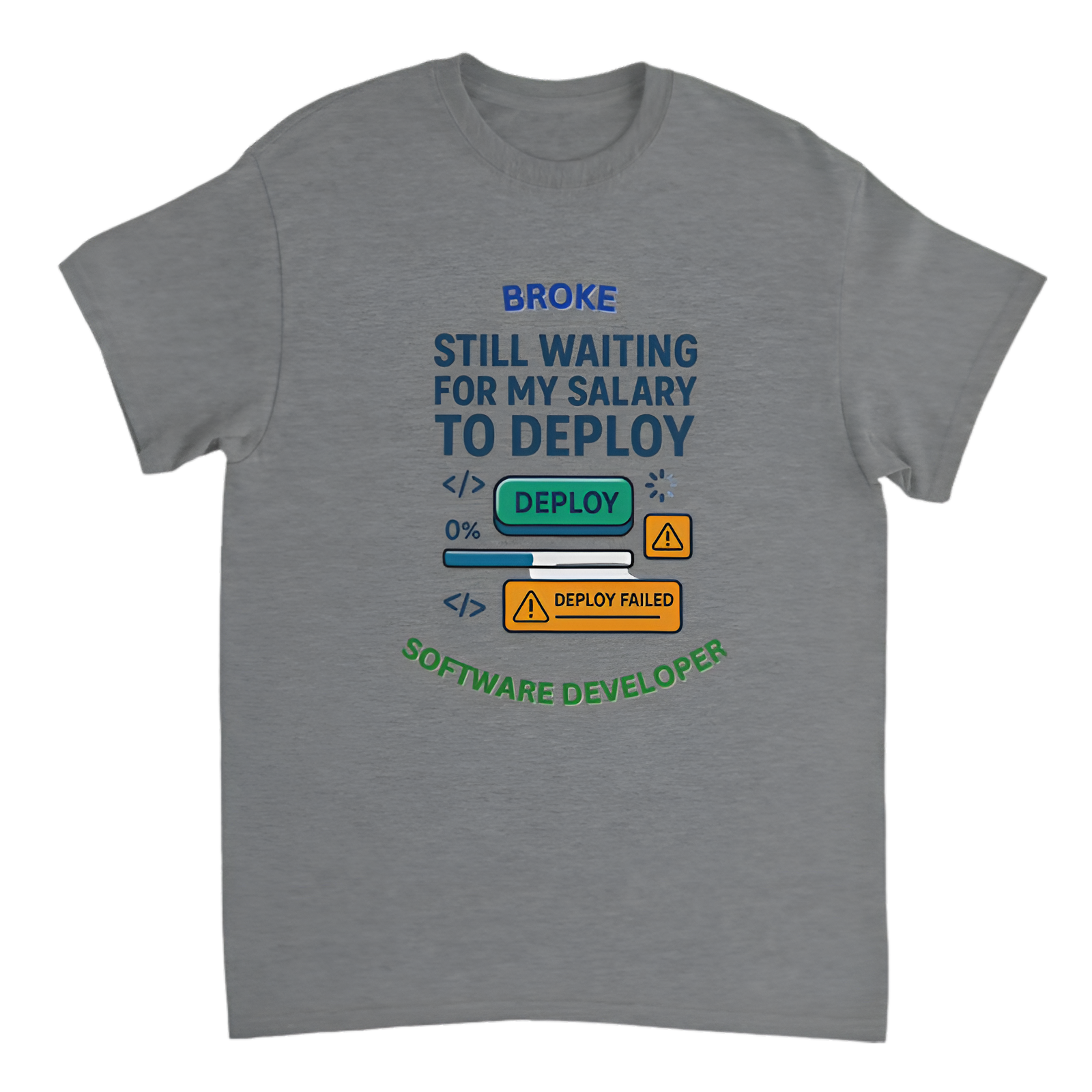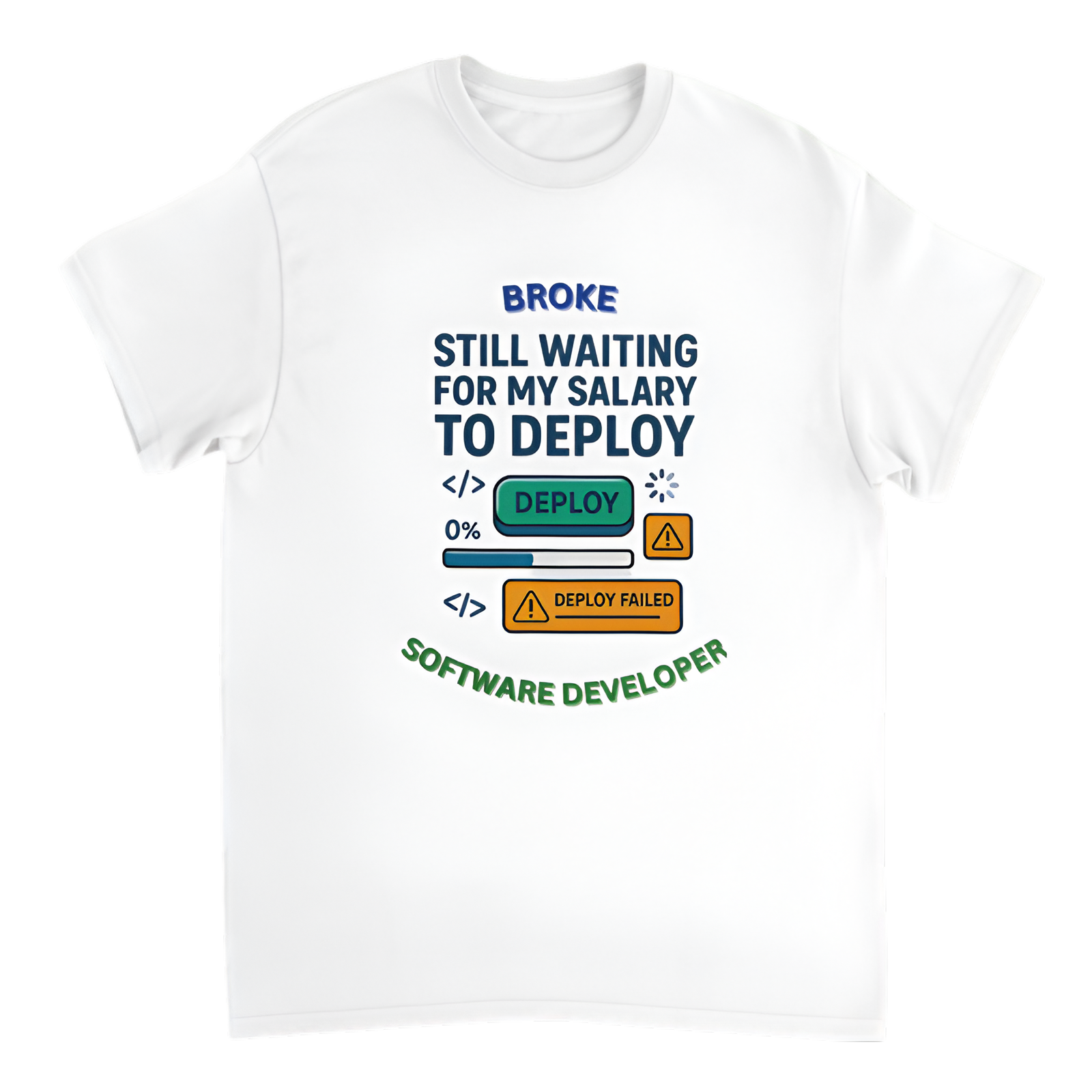Perfect for developers stuck in the endless wait, this “Still waiting for my salary to deploy” t-shirt brings humor to the freelance and software life. Crafted from soft, breathable material, this tee offers comfort whether you’re coding, debugging, or just chilling. Show off your coder spirit with this funny and relatable design that’ll get laughs from teammates and friends alike.