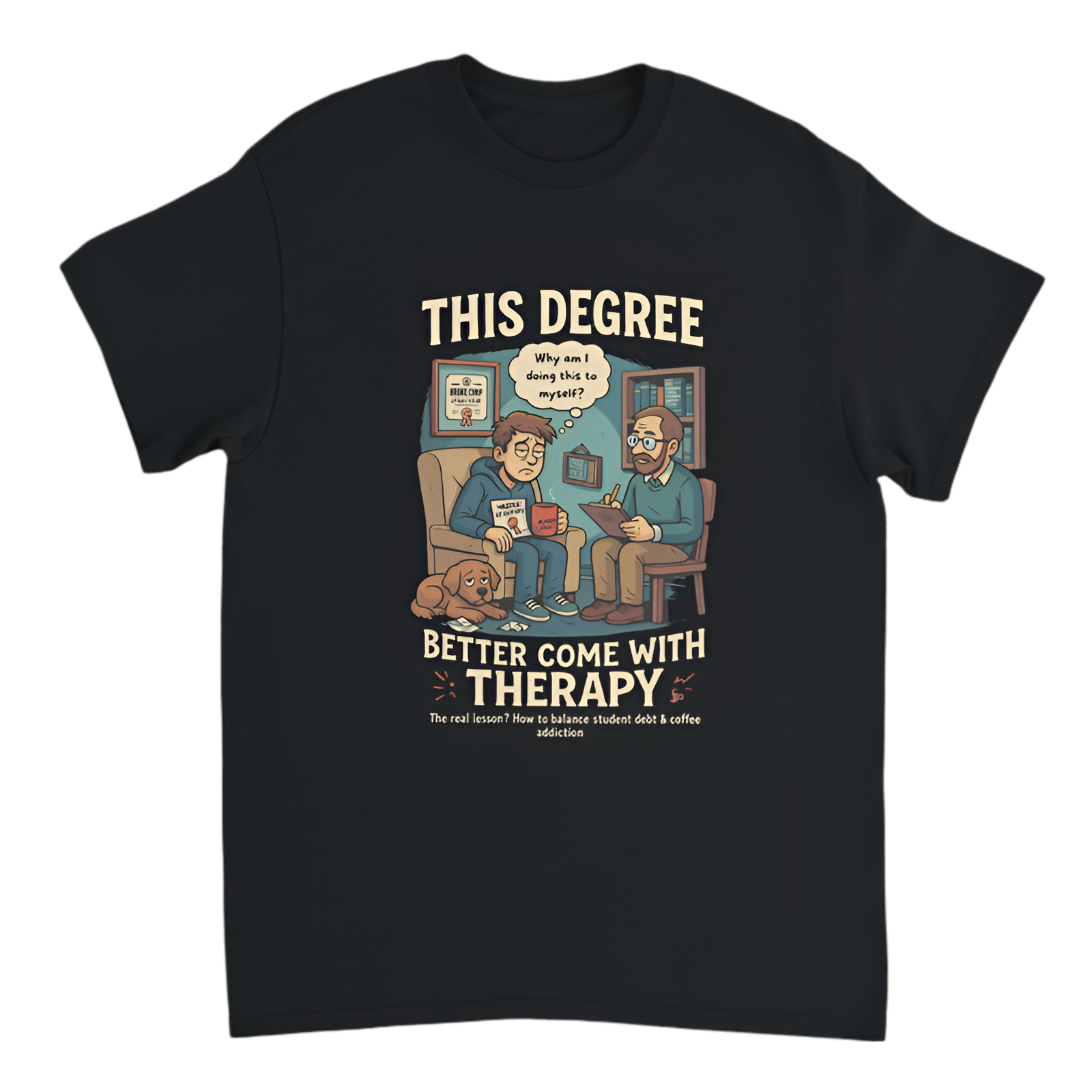 therapy degree funny t-shirt, student mental health humor tee, university stress shirt, college burnout apparel, sarcastic college degree shirt, black graphic tee for students, unisex university struggle t-shirt, relatable academic humor shirt, campus anxiety meme tee, finals week therapy t-shirt