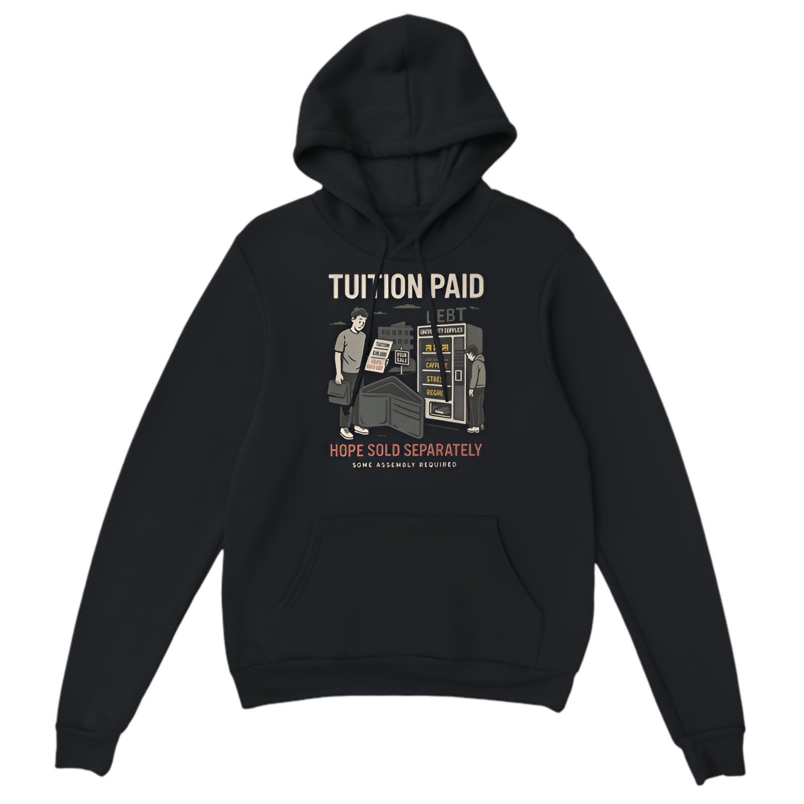 The "Tuition Paid. Hope Sold Separately" black hoodie is the perfect fit for students who’ve handed over their life savings (or future debt) but aren’t quite sure what they’re getting in return. It’s cozy, sarcastic, and painfully real — just like the university experience. Whether you're walking to class or questioning every life choice, this hoodie has you covered in both warmth and dark humor.