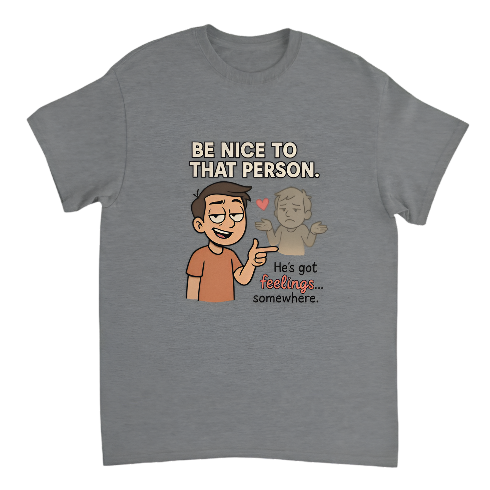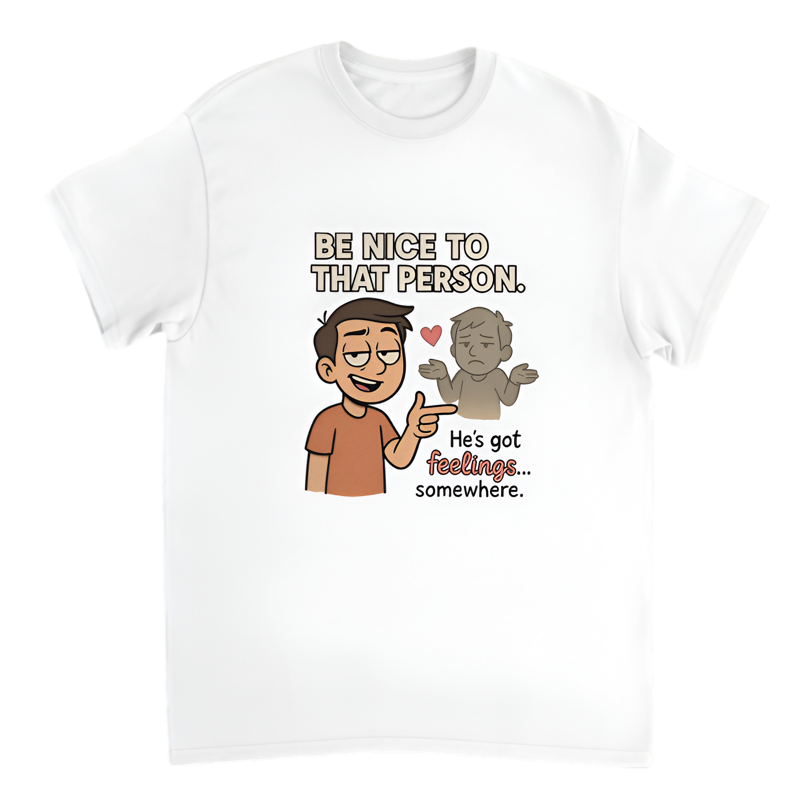 Show off your sarcastic side with this witty tee that says, “Be nice to that person. He’s got feelings… somewhere.” Perfect for those who love clever humor with a dash of sass. Made from soft, breathable fabric, this shirt is great for casual wear, social outings, or making a cheeky statement wherever you go.