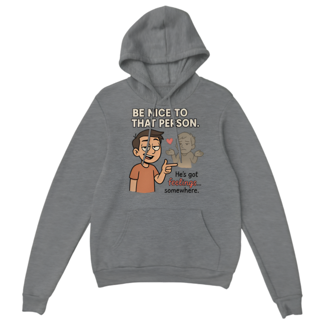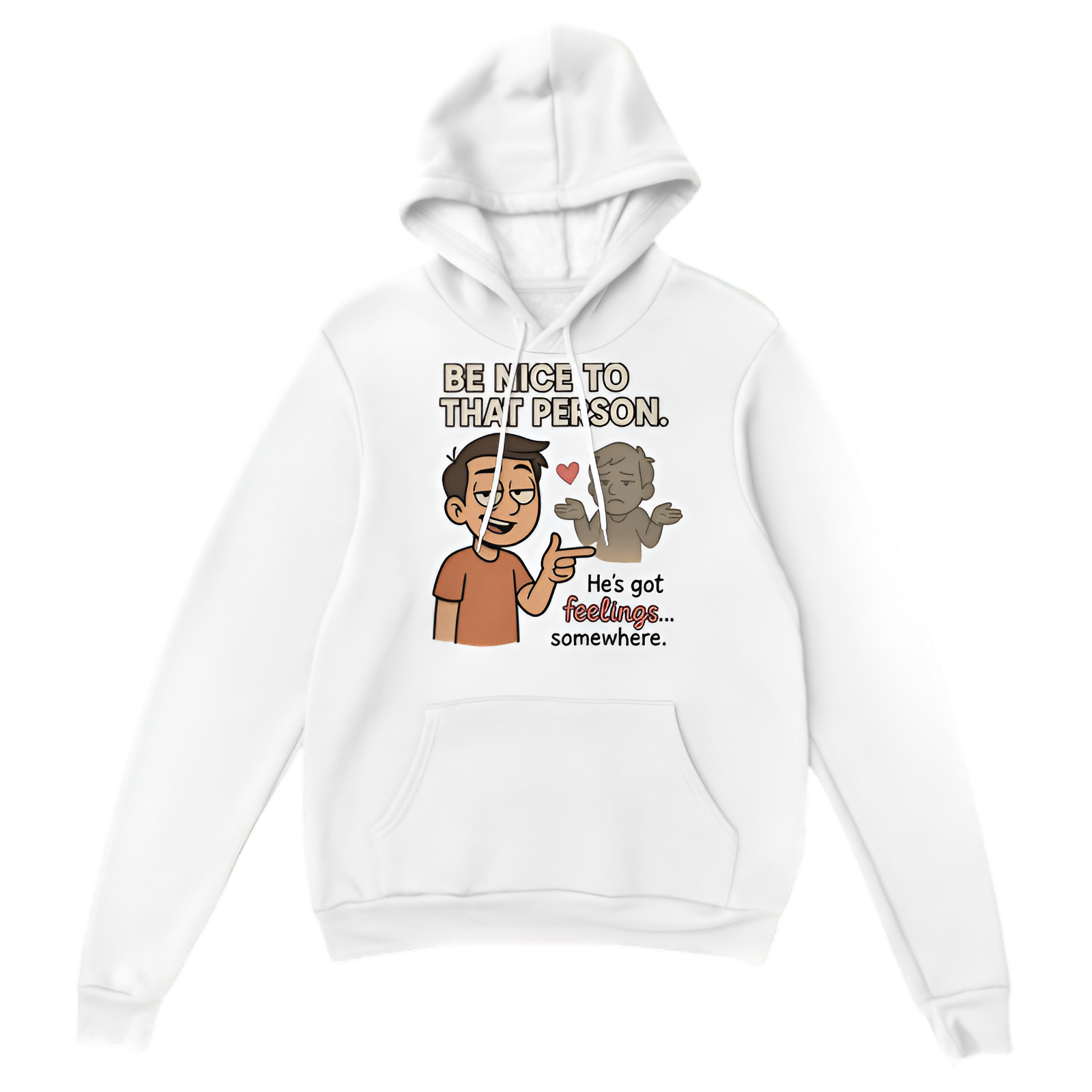 Keep it playful and cheeky with this hoodie that says, “Be nice to that person. He’s got feelings… somewhere.” Perfect for those who love a little sarcasm with their humor. Made from soft, warm fabric with a relaxed fit, this hoodie combines comfort with a witty, tongue-in-cheek message.