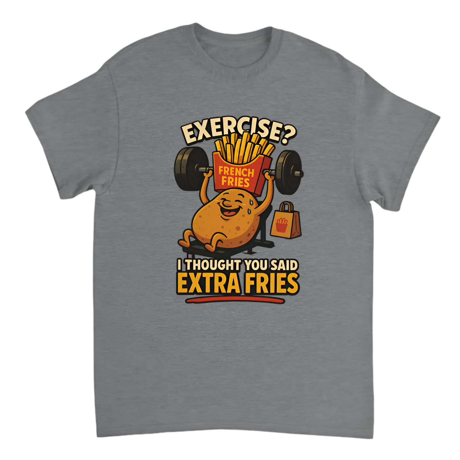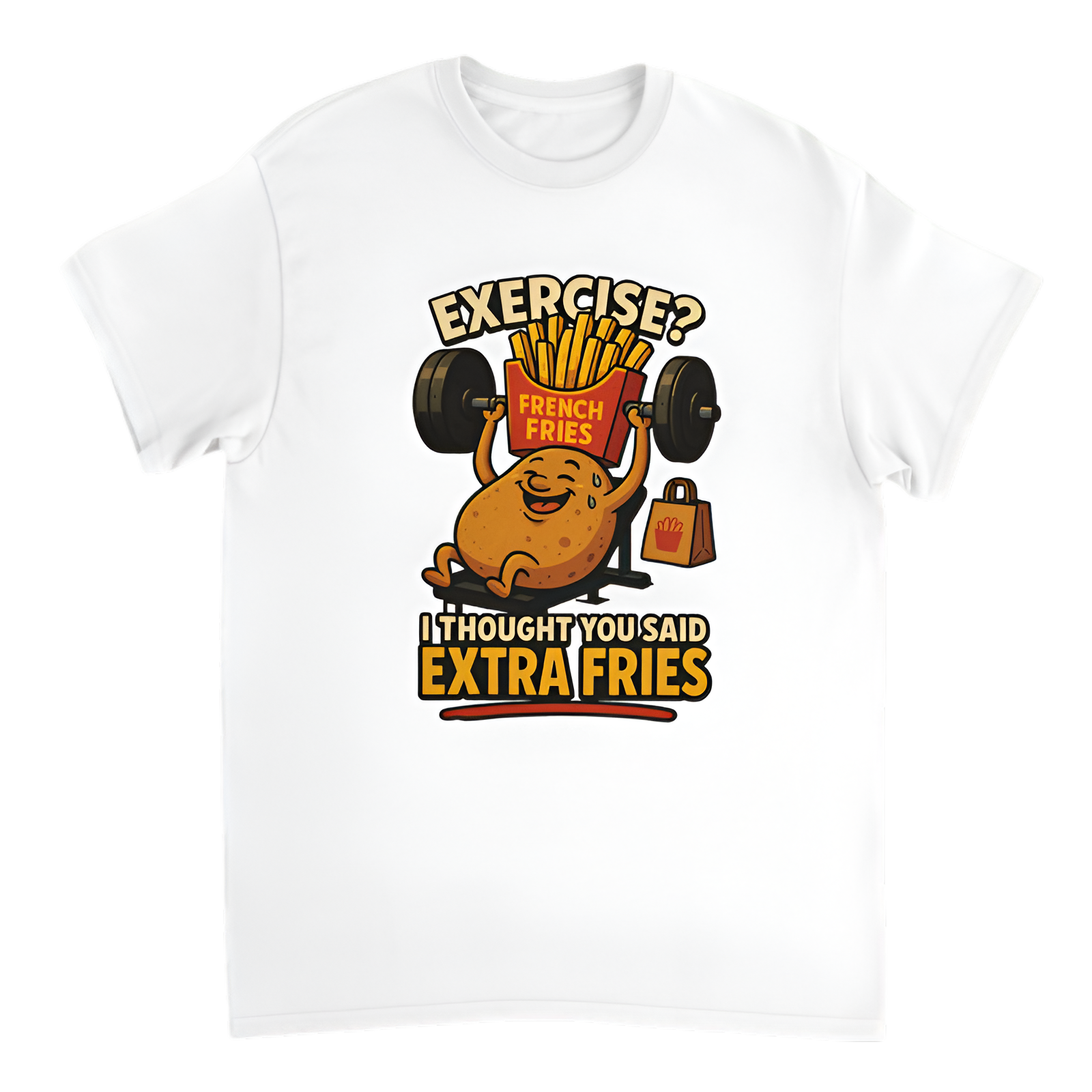 Show off your love for comfort food with this hilarious tee that’s perfect for anyone who’d rather snack than sweat! Featuring the witty phrase "Exercise? I thought you said extra fries," this shirt combines humor and style for casual days, food runs, or just chilling with friends. Made from soft, breathable fabric, it’s comfy enough to wear all day — because let’s be honest, who wants to exercise when you can enjoy fries?