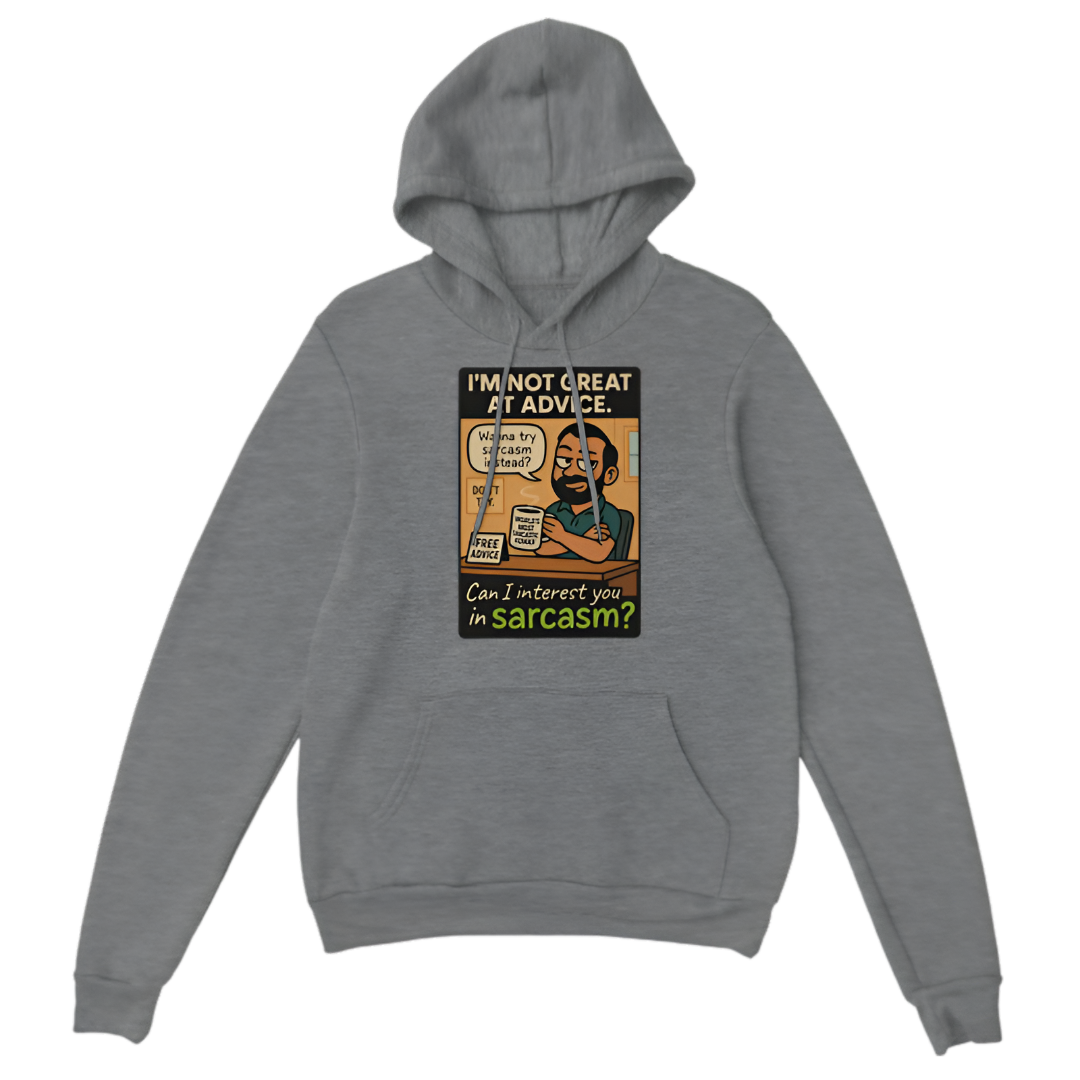 Stay warm and witty with this hoodie that says, “I’m not great at advice. Can I interest you in sarcasm?” Perfect for those who prefer humor and sarcasm over serious advice. Crafted from soft, cozy fabric with a relaxed fit, this hoodie is ideal for casual wear, socializing, or just showing off your clever side.