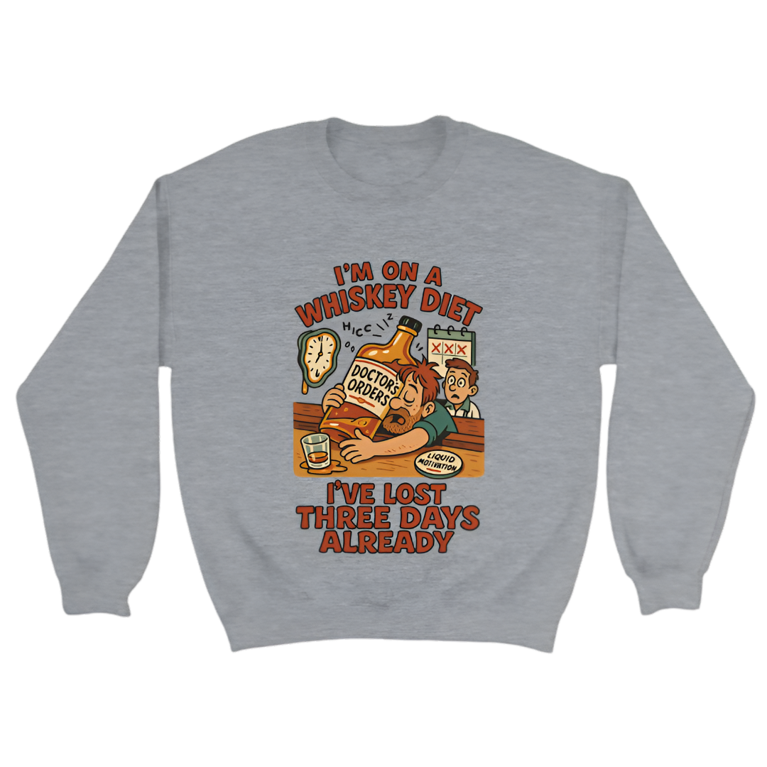 whiskey diet sweatshirt, funny drinking sweatshirt, humor alcohol quote apparel, sarcastic whiskey lover clothing, witty bar joke sweatshirt, lost three days sweatshirt, party humor sweatshirt, drunk lifestyle fashion, booze joke sweatshirt, hangover humor apparel