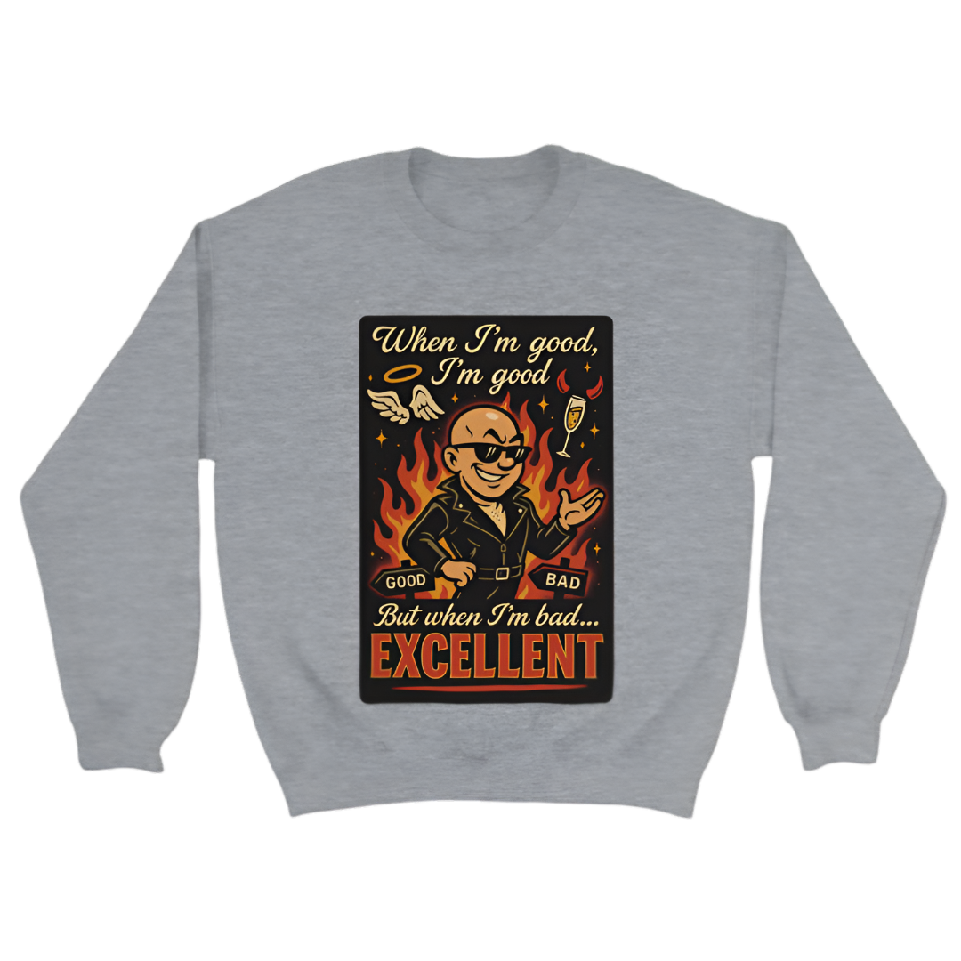 Confidence? Off the charts. This “When I’m good I’m good, but when I’m bad I’m excellent” sweatshirt is for the bold, the cheeky, and the downright unforgettable. It's got just the right mix of sass, swagger, and self-love—because playing nice is overrated.