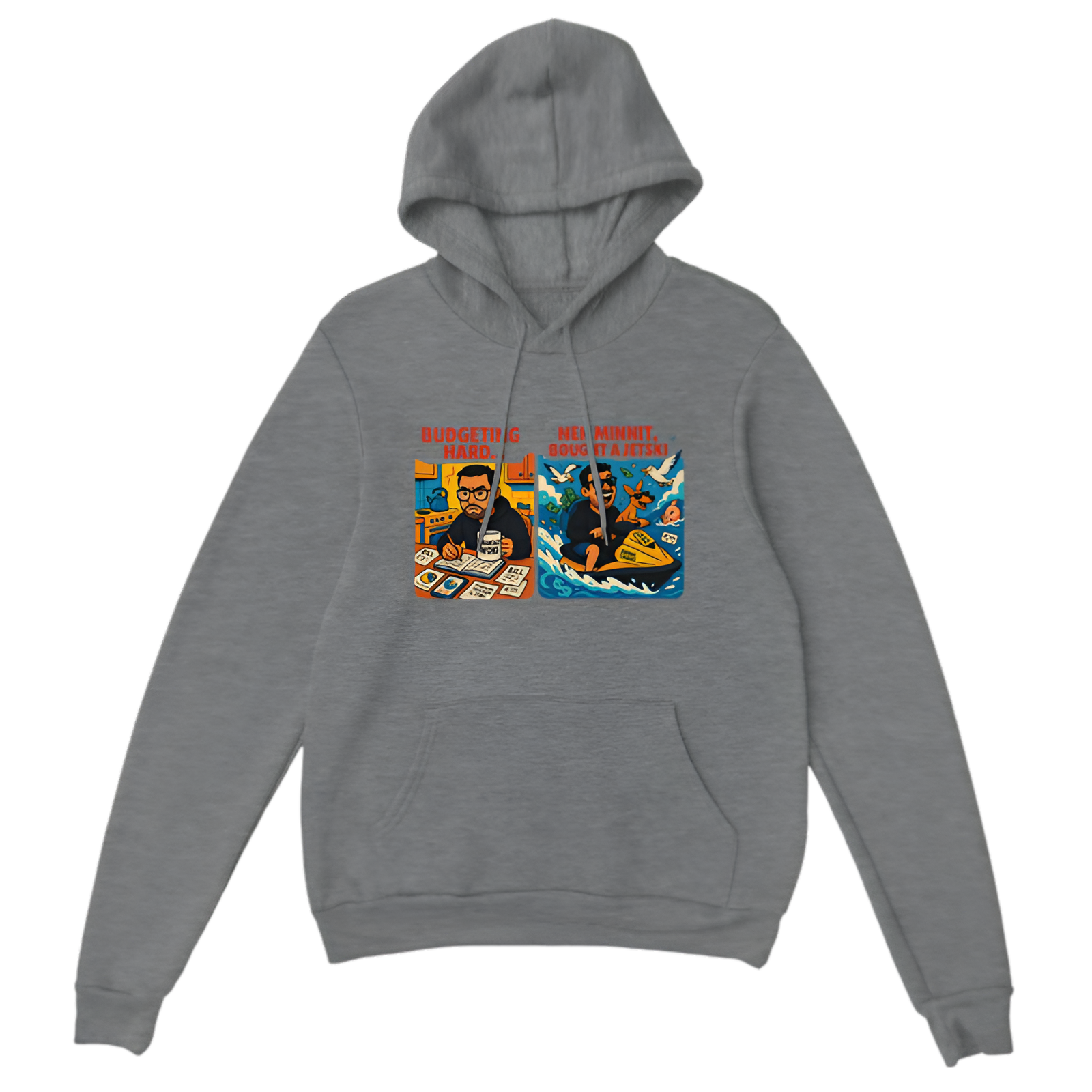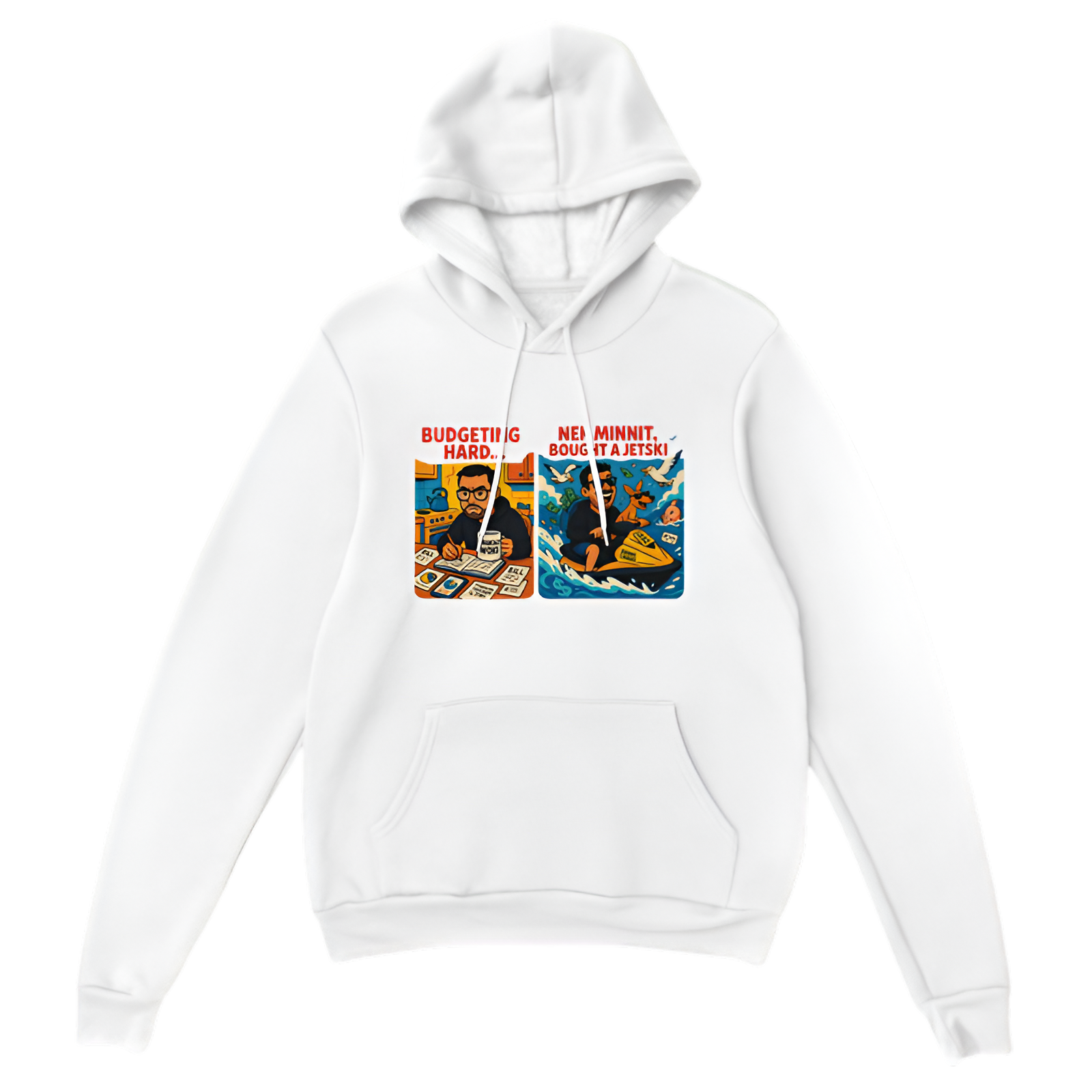 Trying to stick to the budget... nek minnit, you’ve gone and bought a jetski. This hilarious hoodie perfectly captures the struggle between financial discipline and impulse buys, Kiwi/Aussie style. Made with soft, warm fabric and a cozy fit, it’s perfect for anyone who loves to laugh at life’s funny contradictions while staying comfy.