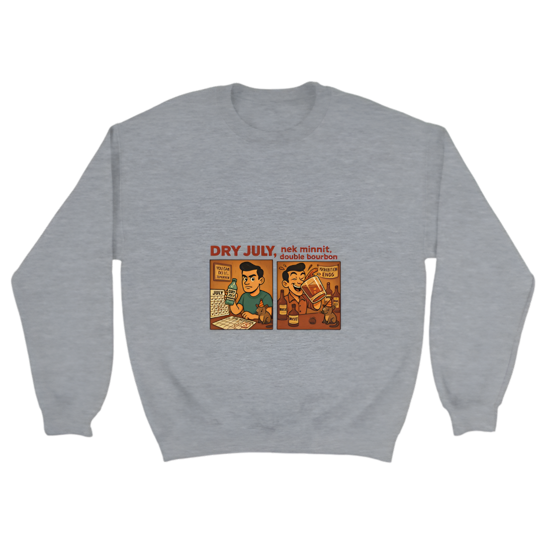 For those who start Dry July with the best intentions but quickly find themselves reaching for a double bourbon instead. This “Nek Minnit | Dry July - double bourbon” sweatshirt perfectly captures that hilarious slip-up with Aussie slang and humor.