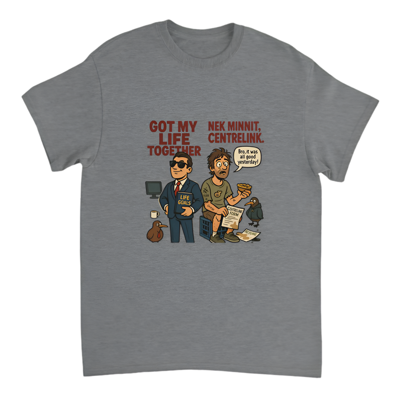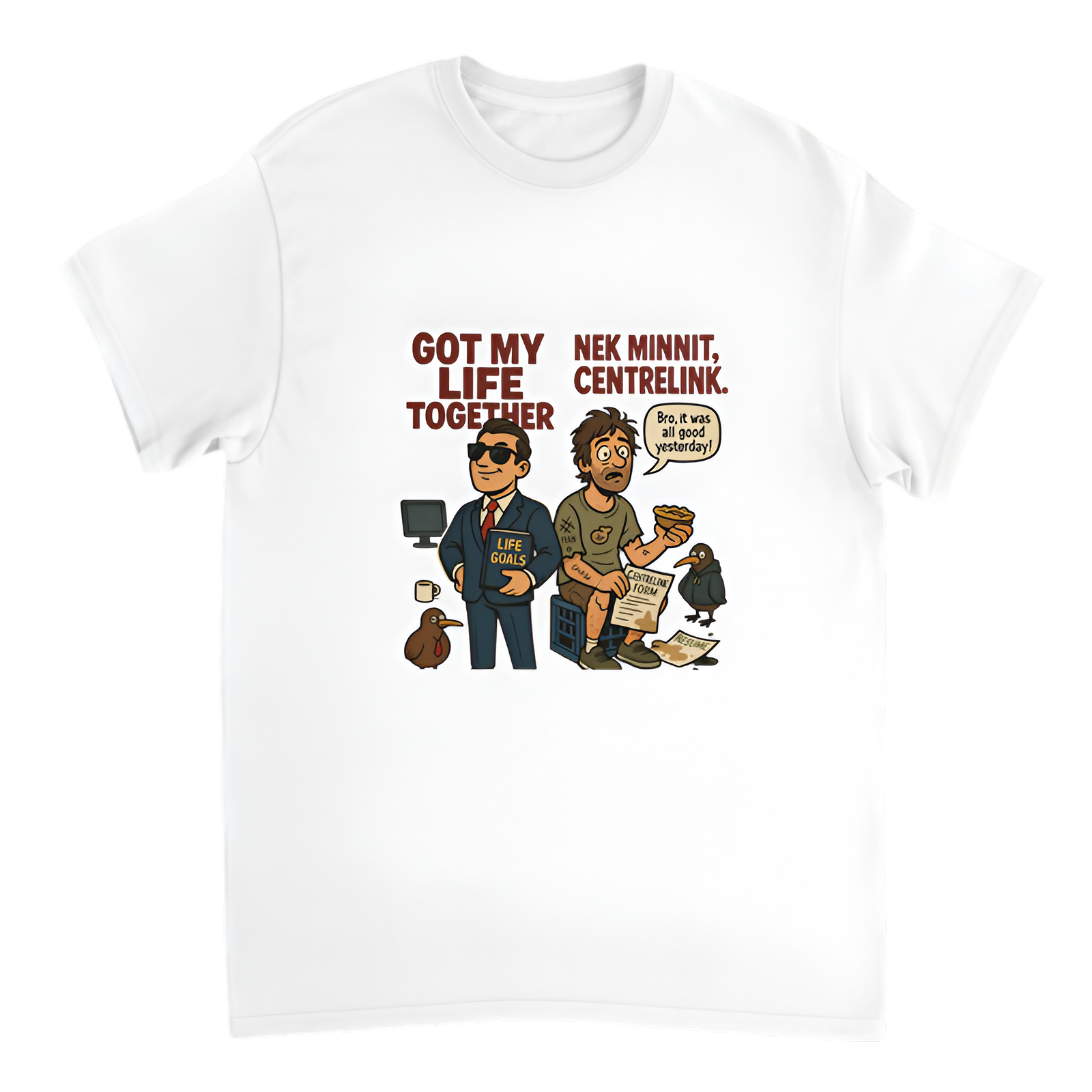 Life’s full of ups and downs, and sometimes just when you think you’ve got it all sorted... nek minnit, Centrelink. This cheeky tee captures that all-too-relatable moment with a sharp Kiwi/Aussie twist. Made from soft, breathable fabric, it’s perfect for anyone who’s mastered the art of adulting just enough to keep rolling with the punches — and the benefits.