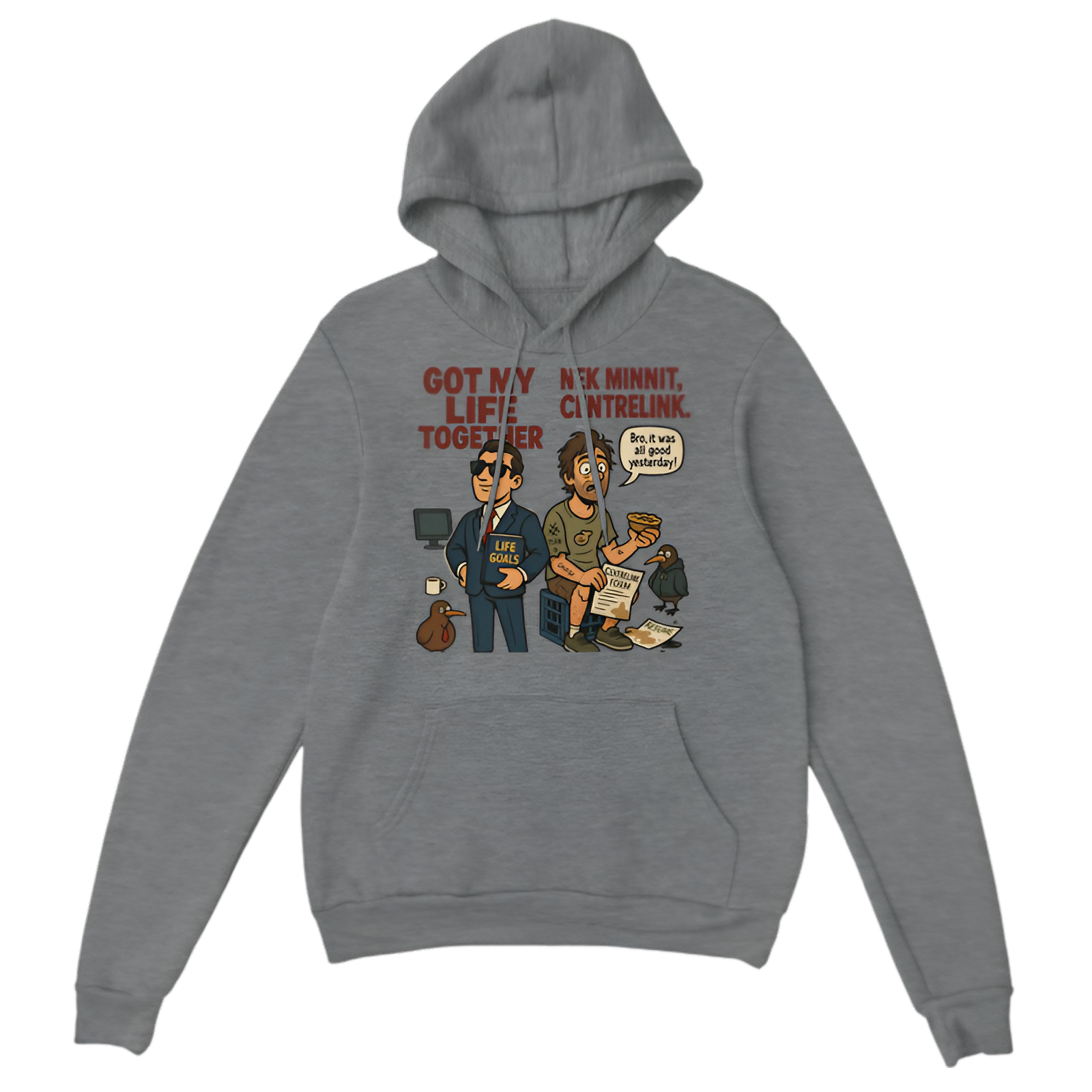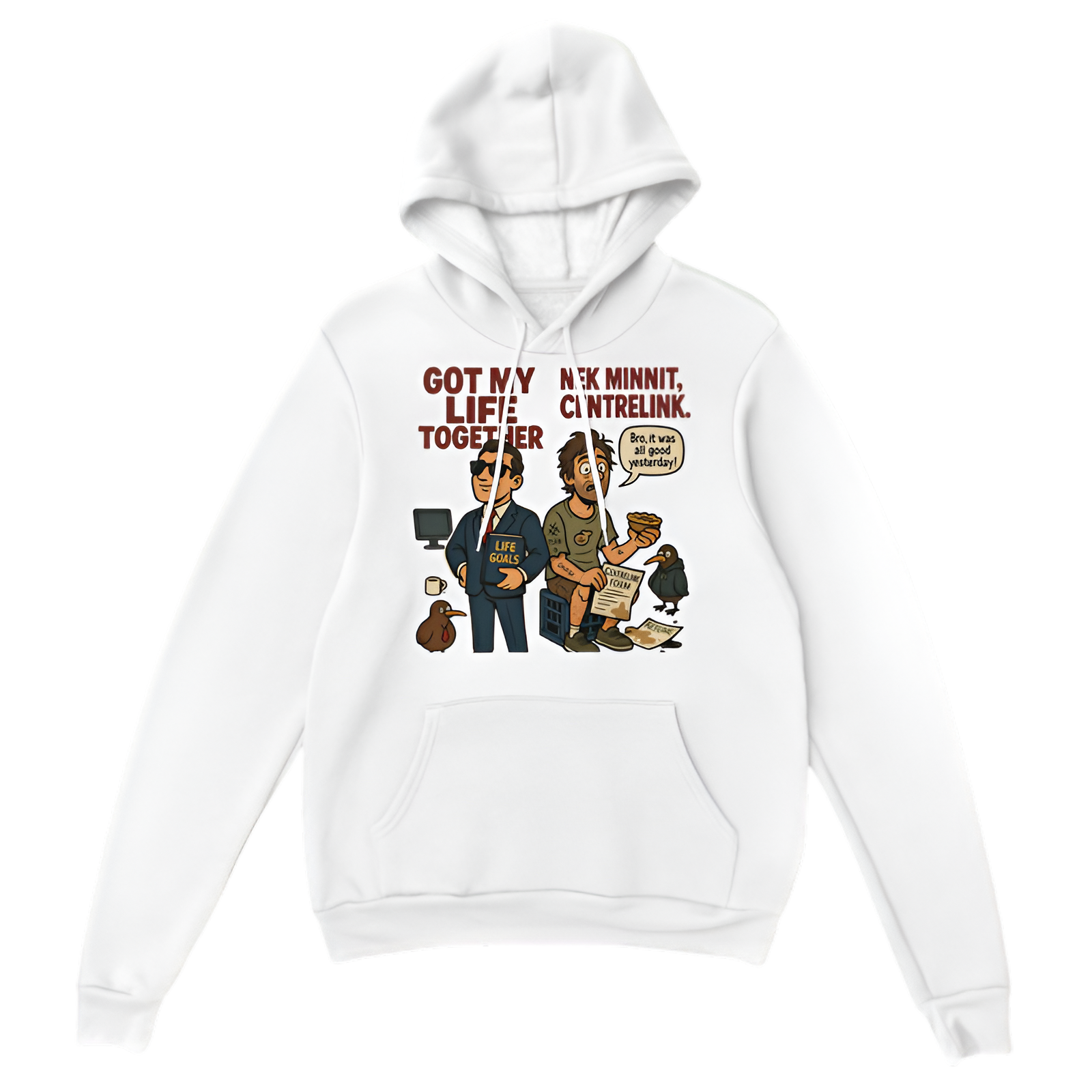 Thought you had your life sorted... nek minnit, back to Centrelink. This cheeky hoodie captures that all-too-real Kiwi/Aussie moment when plans hit a bump but you keep your sense of humor. Made from soft, warm fabric with a cozy fit, it’s perfect for chilling out or making a statement while staying comfy.
