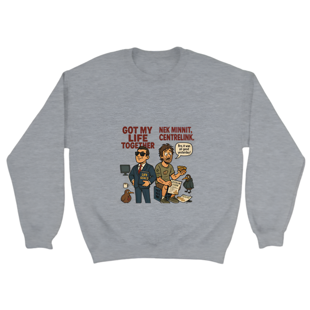 Life’s unpredictable, and sometimes “getting it together” means a quick visit to Centrelink. This “Nek Minnit | Got my life together - Centrelink” sweatshirt is a cheeky nod to those moments when adulting feels more like survival. Perfect for anyone who embraces the struggle with humor and style.