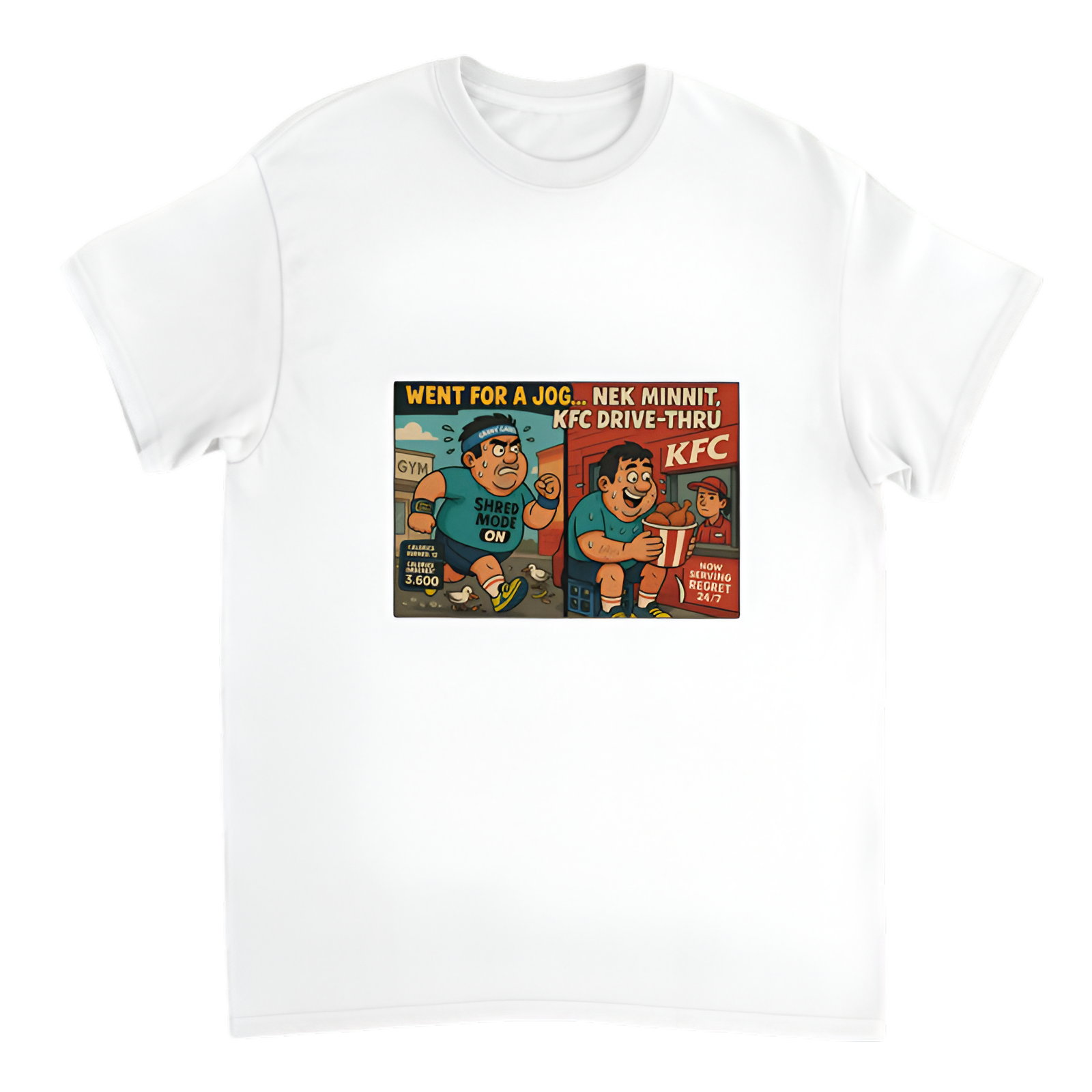 You planned to get fit, you laced up your sneakers, but nek minnit, you’re at the KFC drive-thru. This hilarious tee perfectly sums up the classic Kiwi/Aussie struggle between fitness goals and fried chicken cravings. Crafted with comfy, breathable fabric, it’s a cheeky nod to those who keep it real — one snack at a time.