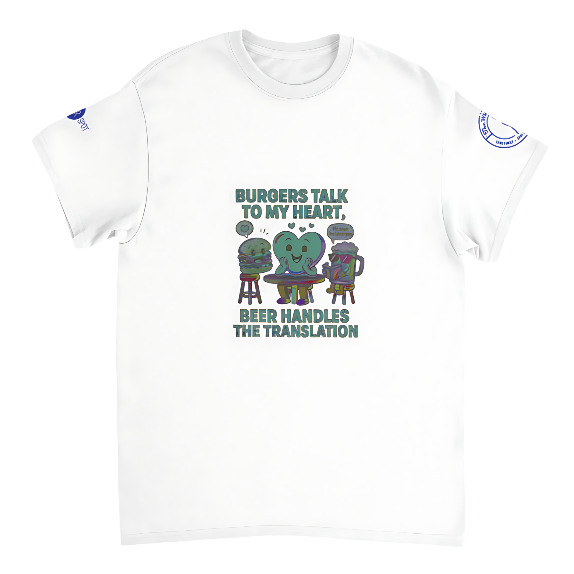 When burgers whisper sweet nothings, beer makes sure your soul hears it loud and clear. This tee is for those who understand that food is love, and beer is the best wingman. Flavored with humor and crafted for comfort, it’s your perfect go-to for good times and greasy bites.
