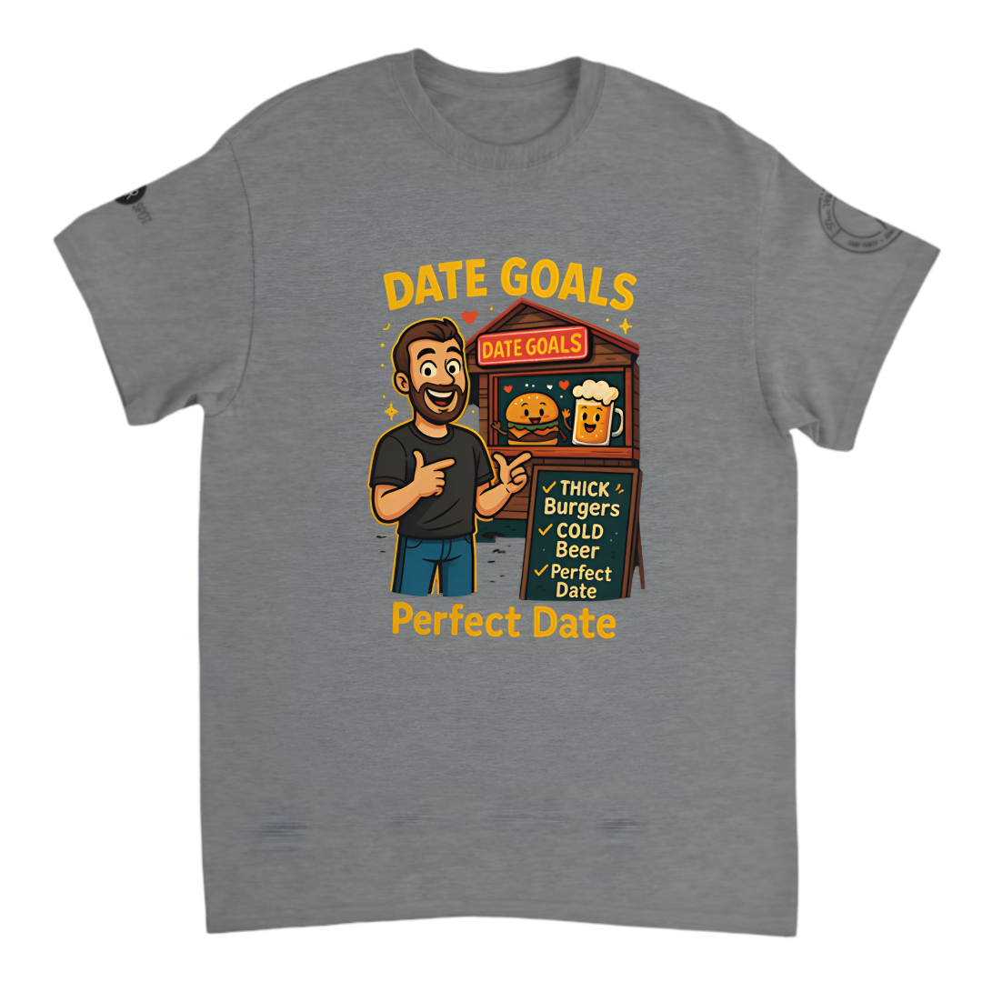 Romance isn’t dead—it’s just grilled and served with a pint. This tee lays down the only dating advice that truly matters: skip the fancy stuff and head straight for thick burgers and cold brews. Whether you’re swiping right or already taken, this shirt sets the standard for quality time.
