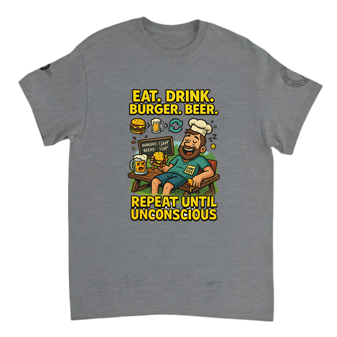 funny foodie t-shirt, burger and beer lifestyle tee, eat drink repeat shirt, food coma humor shirt, weekend indulgence t-shirt, grill party apparel, beer lover graphic tee, foodie quote t-shirt, casual bbq shirt, chill mode repeat tee